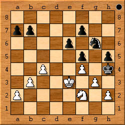 Middle-of-Nowhere 20.03.2003 Hilmar - Alarich [B40] Blitz: 3' 3 Minuten für die gesamte Partie!) Fritz 8 (30s) B40: Sizilianisch Klassisches System mit e7-e6. 1.e4 c5 2.Nf3 e6 3.d4 cxd4 4.Nxd4 d5 [4...Nf6 5.Nc3 Bb4 6.Bg5=] 5.exd5 Qxd5 6.Bb5+ [6.Nc3!? Qe5+ 7.Be3²] 6...Bd7 7.Bxd7+ Qxd7 8.0–0 Nf6 9.c4 Bc5 10.Be3 Bxd4 [10...Nc6 11.Nxc6 Bxe3 12.fxe3 Qxd1 13.Rxd1 bxc6 14.Rd6=] 11.Bxd4 0–0 [11...Nc6 12.Bxf6 gxf6 13.Nc3=] 12.Nc3 Nc6 13.Bxf6 Qxd1 14.Raxd1 gxf6 15.Ne4 f5 16.Nf6+ Kg7 17.Nh5+ Kg6 18.Nf4+ Kf6 19.Rd2 Rad8 20.Rfd1 Rxd2 21.Rxd2 Rd8 22.Rxd8 Nxd8 23.Kf1 Nc6 24.Ke1 Ne5 25.b3 Kg5 26.Nh3+ Kg4 Aktiver König im Endspiel 27.Ke2 h5? [¹27...f4 ist noch spielbar 28.f3+ Kf5 29.g4+ fxg3 30.hxg3 Nc6=] 28.f3++- Kh4 29.Ke3 Ng6 30.f4 Kg4?? der Druck provoziert den entscheidenden Fehler [¹30...e5 31.fxe5 Kg4 32.Nf2+ Kg5+-] 31.Nf2+ Kh4 32.g3# 1–0 Ein fantastisches Bauernmatt!! Wenn ich auf meine Fähigkeiten, meine Produktivität oder Kreativität angesprochen wurde, habe ich nur gelächelt und gemurmelt: „ Geburtsfehler!“Bei Leonardo und Leibniz jedoch hilft kein Humor mehr. Da versagt selbst das Lächeln – man steht sprachlos vor der Möglichkeit des Menschen. |