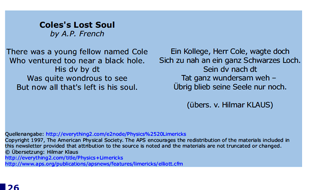 Ein Kollege, Herr Cole, wagte doch sich zu nah an ein ganz Schwarzes Loch. Sein dv nach dt tat ganz wundersam weh – nur die Seele, die blieb ihm dann noch!