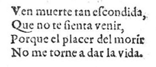 Original Ven, muerte, tan escondida que no te sienta venir, porque el placer del morir no me torne a dar la vida. |
