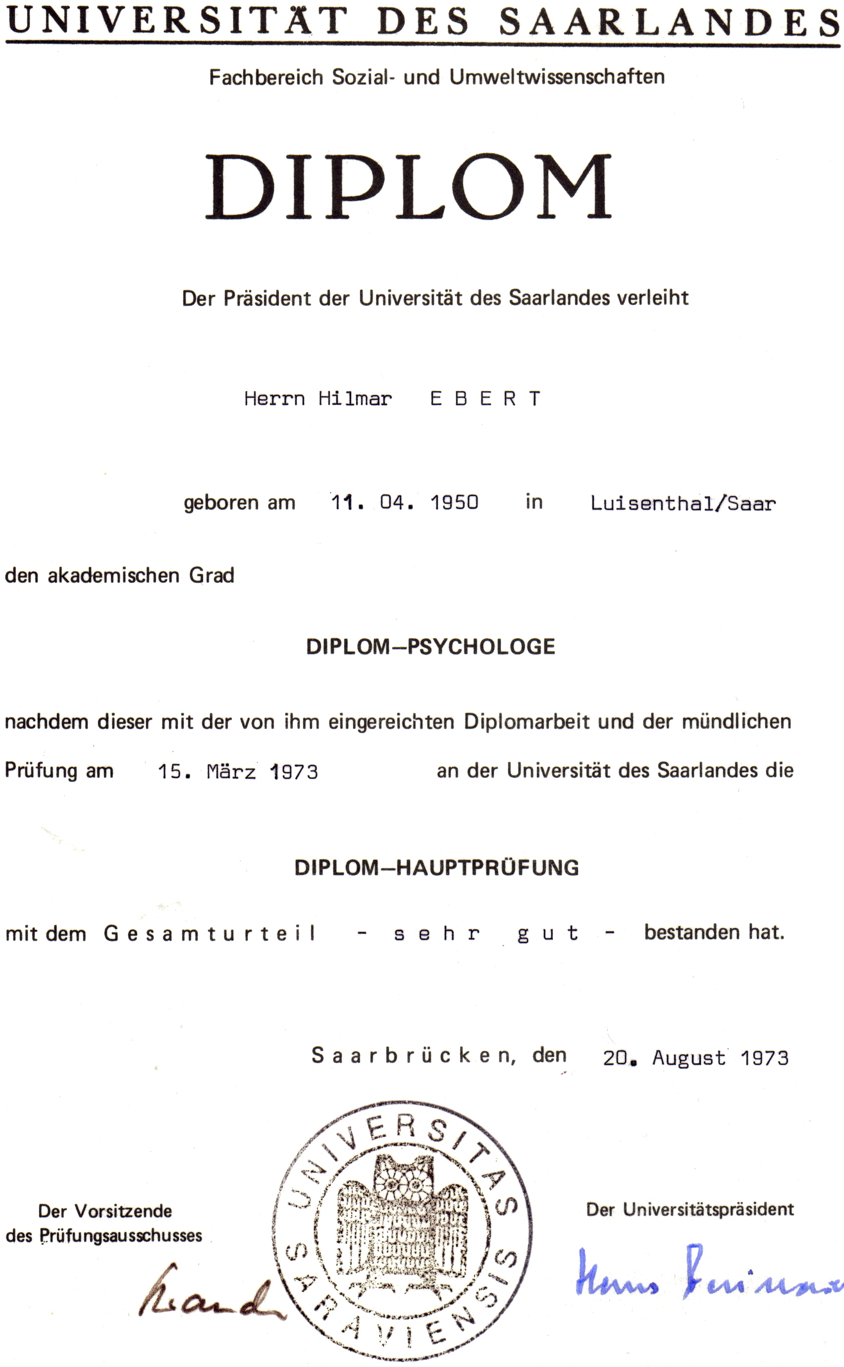The final part of the diploma (equivalent to a Master’s degree) in psychology — normally completed in the sixth year, in my case the fourth — took place during the three months following all examinations. After waiting six months because I was under the required age, I became the youngest psychologist in the history of the institute, aged just 22 (‘sehr gut’ = best grade). :-)