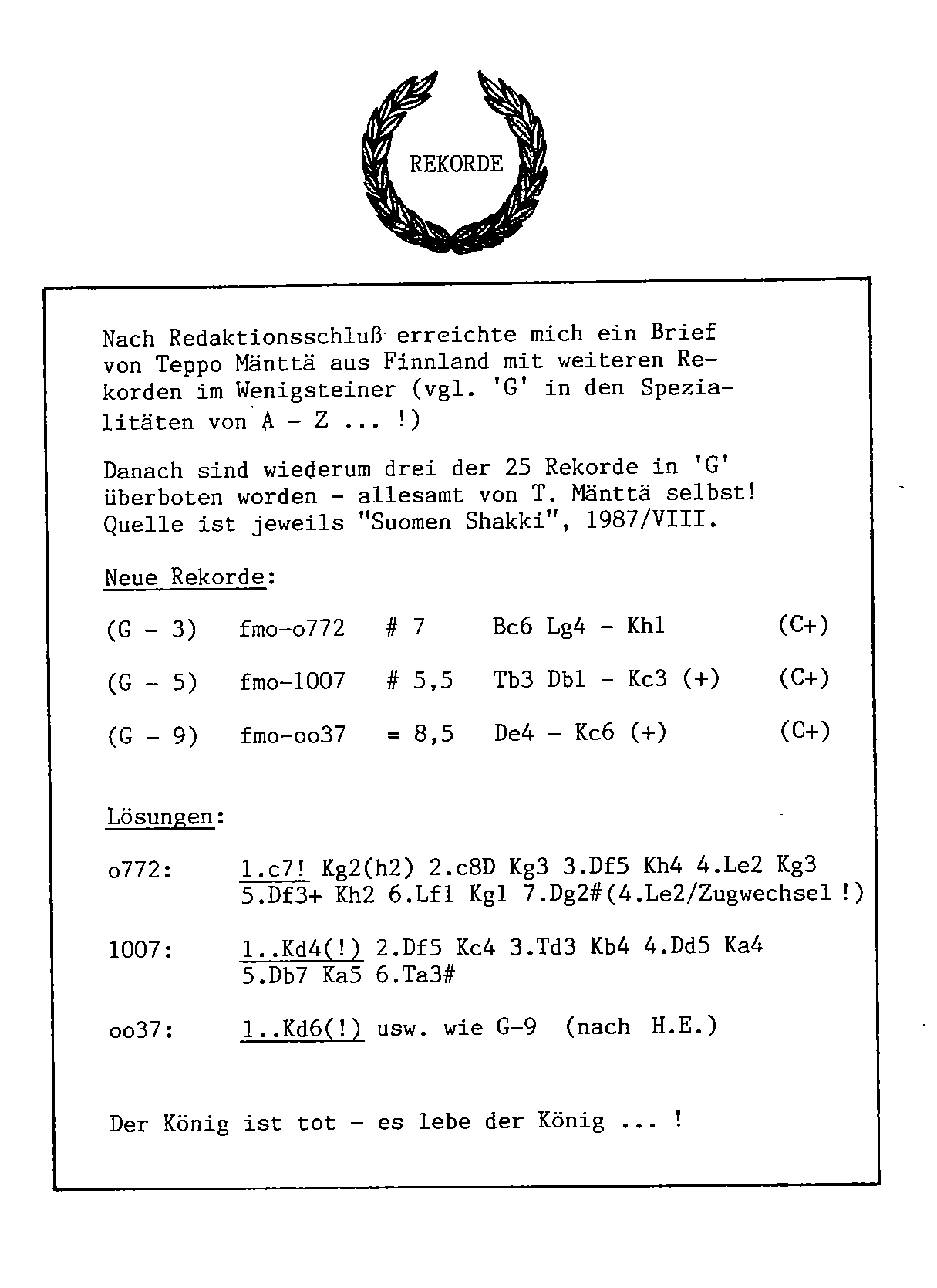 Partien, Mattprobleme, Hilfsmatts, Märchenschach, Spezialitäten.