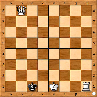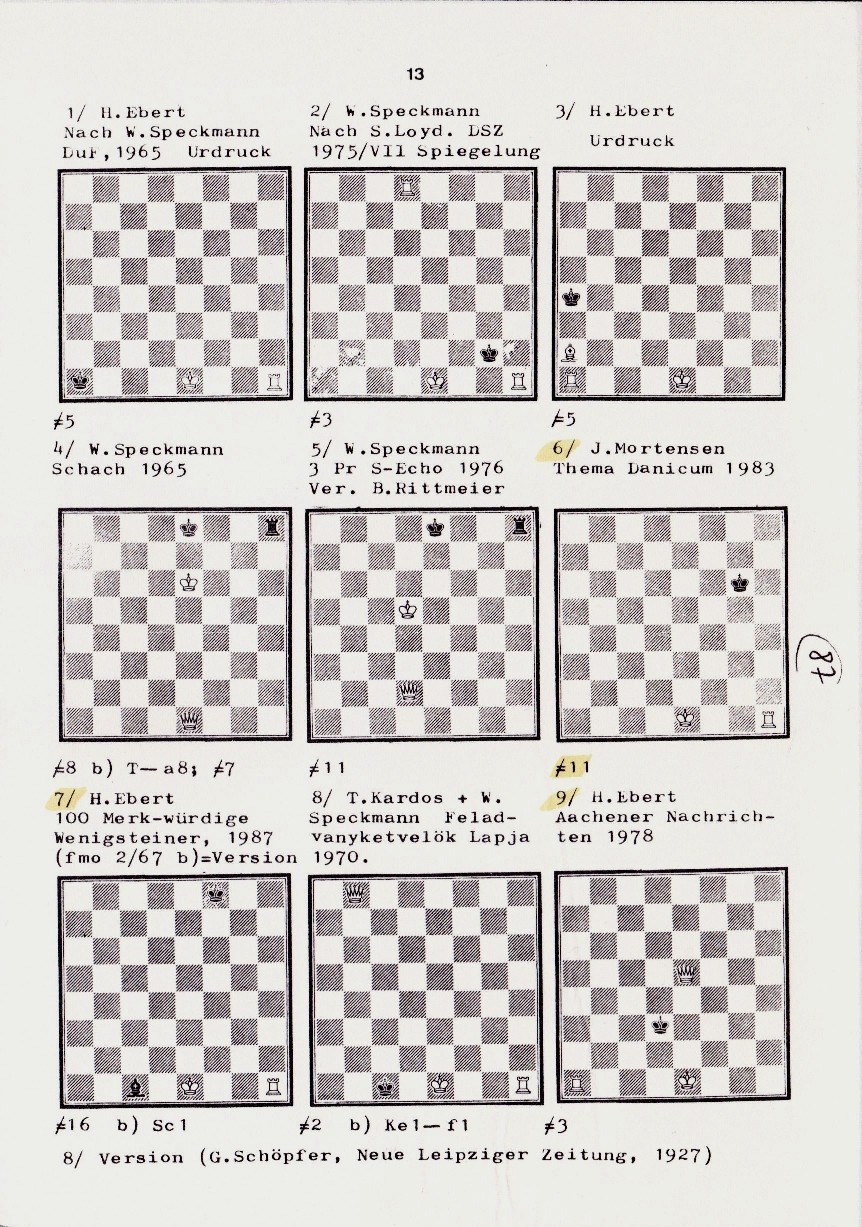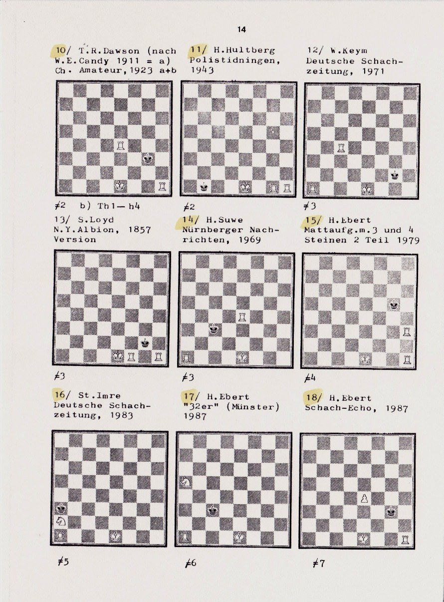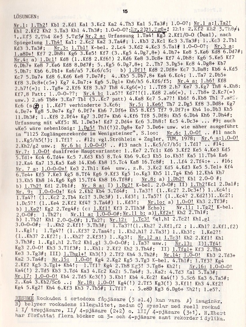 1.Dcl! Kd8 (1…Kf8 2.Kf6!) 2.Kd6 Ke8 3.Dc8+ Kf7 4.Dh8 Nr. 4 b: 1.Th2! Kb8 6.Dg7+ Kcl 7.b4 Tdl# b) 1.Dfl Kd7 6.Df8# 3.Da8 Kb6 4.Kd5 5.Da7+ Kb6 6.Kd6 Ke8 7.Dc6/c5; c) 1.Dfl Kd8 2.Df8# Kc7 3.Da8+ Kb6 4.Kd5 5.Da7+ Kb6 6.Kd6 Ke8 7.Dc6/c5; b) 1.Dfl 1…Kc7 4.Dc4! 5…Kd6. Nr. 5: 1.Th7! Kgl 2.Kf2 Kg2 3.Lh6! (Echo) Nr. 6: 1.0-0! .. #1 nach 1...Kg5/h5(!); 1.Tf1? ... #12; vgl. Ströhlein + Zagler, TUM, 1978 Nr. 6 a: 1.O-O! 2.Kh2/e2 usw.; Nr. 6b: 1.0-0-0!.... #13 nach 1...Kc5/c7/b5; 1.Td1?... #14. Nr. 7: 1.0–0–0! dualfreie Hauptvariante: 1.Ke7 2.Tc1: Kd6 3.Kf2 Ke5 4.Ke3 Kd5 5.Td1+ Kc4 6.Td4+ Kc5 7.Kd3 Kb5 8.Tc4 Kb6 9.Kc3 Kb5 10.Kb3! Ka5 11.Tb4 Ka6 12.Ka4 Ka7 13.Ka5 Ka8 14.Kb6 Kb8 15.Tc4 Ka8 16.Tc8#; 1...Lf4 2.Tf4:+ ... #16 Nr. 7 a: 1.0–0–0! Ke3 2.Th1! Ke4 usw. – z.B. 3.Kc5 Kd2 4.Ke3 Ke5 5.Te1+ Kf4 6.Te4+ Kf5 7.Ke3 Kg5 8.Tf4 Kg6 9.Kf3 Kg5 10.Kg3 Kh5 11.Tg4 Kh6 12.Kh5 Kh7 13.Kh3 Kh8 14.Kg6 Kg8 15.Tf4 Kh8 16.Tf8# Nr. 8: a) 1.Dh2! Kb1 2.0–0#; b) 1.Th2! Kd1 2.Dbl# Nr. 8 a (I): 1.Dg2! K–bel. 2.0–0#; Nr. 8 a (II): 1.Th2! Kc1 2.Dal#; Nr. 9: 1.0–0–0+! Kc4 2.Kb2 Kb4 3.Td4+; 1.Ta3?! (1…Kc2 2.Dc3+!) 1...Kc4!; 1.Ta4?! (1...Kc2 2.Tb4 Kc1? 3.Dc3#) 1...Kd3!; 1.Ta5?! (1...Kc4? 2.Kd2!) 1...Kc2!; 1.Dc5?! (1...Ke4 2.Kf2 Kf4? 3.Ta4#) 1...Kd3!. Nr. 10: a) 1…0–0! Kh3 2.Tf3#; b) 1.Ke2 Kg2 2.Teg4#; 1.Kf1! Kf3 1.T1h3# Echo). Nr. 11: 1.Tg2! K-bel. 2.0-0#; 1..Th2?. Nr. 11 a: 1.0–0–0#! Nr. 11 b: a) 1.Kf2+! Kh2 2.Th1#. Nr. 11 b: a)1.Kf2+ Kh2 2.Th1#; b) 1.Tb2! Kh1 2.0-0-0#; 1.Ta2?. Nr. 12: 1.Tc3! Kg1,h1 2.Tc2! Kh1,g1 3.0–0–0#; 1…Kh2 2.Kfl! 3.Th3#; 1.Ta3?! (1…Kh2? 2.Kfl,f2 ; 1…Kh1? 2.Kf1,f2) 1…Kg1! ; 1.Tg4?! (1…Kf3? 2.Taa4! ; 1…Kh2,h1? 2.Ta3!) 1…Kh3! ; 1.Ke2?! (1…Kh3? 2.Kf2! ; 1…Kh2? 2.Kf3!) 1…Kg3! ; Nr. 12 a: 1.Tc3! Kh2 2.Kf1! Kh1 3.Th3#; 1…Kgl,h1 2.Tc2 Kh1,gl 3.0–0–0#; 1.Ta3? usw.; Nr. 13: I) 1.Tf4! Kg3 2.0–0! Kh3 3.T1f3#; 1...Kh1: 2.Kf2 Kh4 3.Th2#; II) 1.Tfg1+ Kf3 2.Th4 Ke3 3.Tg3#; III) 1.Thg1+! Kh3(!) 2.Tf2 Kh4 2.Th2#. Nr. 14: 1.0–0! Kb3 2.Td3+ Ka2 3.Ta4# Nr. 15: 1.0–0! Kg4 2.Kg2 Kg5 3.Tg3 K–bel. 4.Th1#; 1.Tf3? Kg4 2.Kf2 Kg5 3.Tgl+ Kh4!; 1.Tf1? Kg4 2.Th8 Kg3! 3.Tg8+ Kh2!