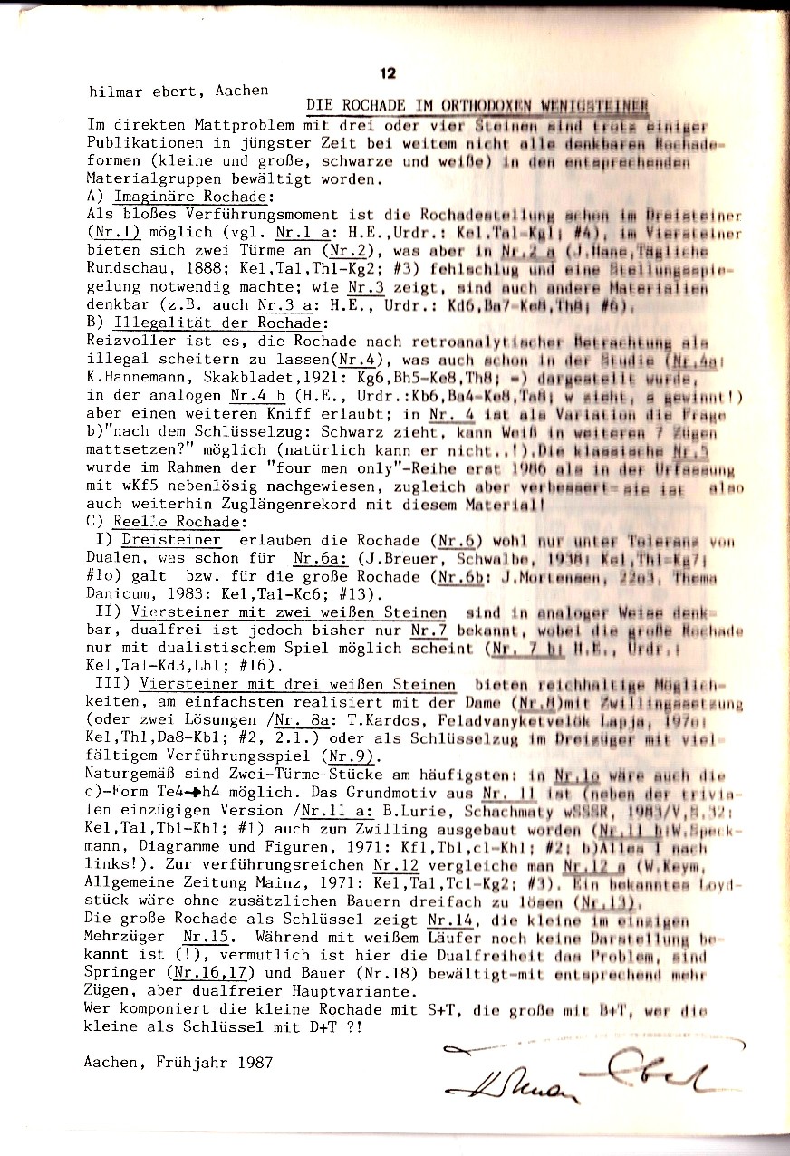 ortodoxe fåpjäsare (3 el. 4) kan vara A) imaginär. RESÜMEE: Die Rochade in orthodoxen Wenigsteiner-Stellungen (3- oder 4-Steiner) kann A) imaginär sein. B) beleuchtet die Illegalität der Rochade, während C) sich mit realer Rochade befasst in I/ Dreisteinern, II/ Viersteinern (2+2) und III/ Viersteinern (3+1). H. Ebert hat mehrere Bücher über 3- und 4-Steiner sowie Rekorde in solchen verfasst.