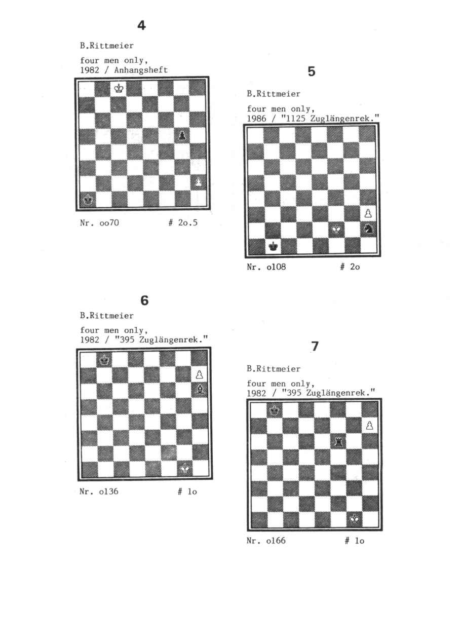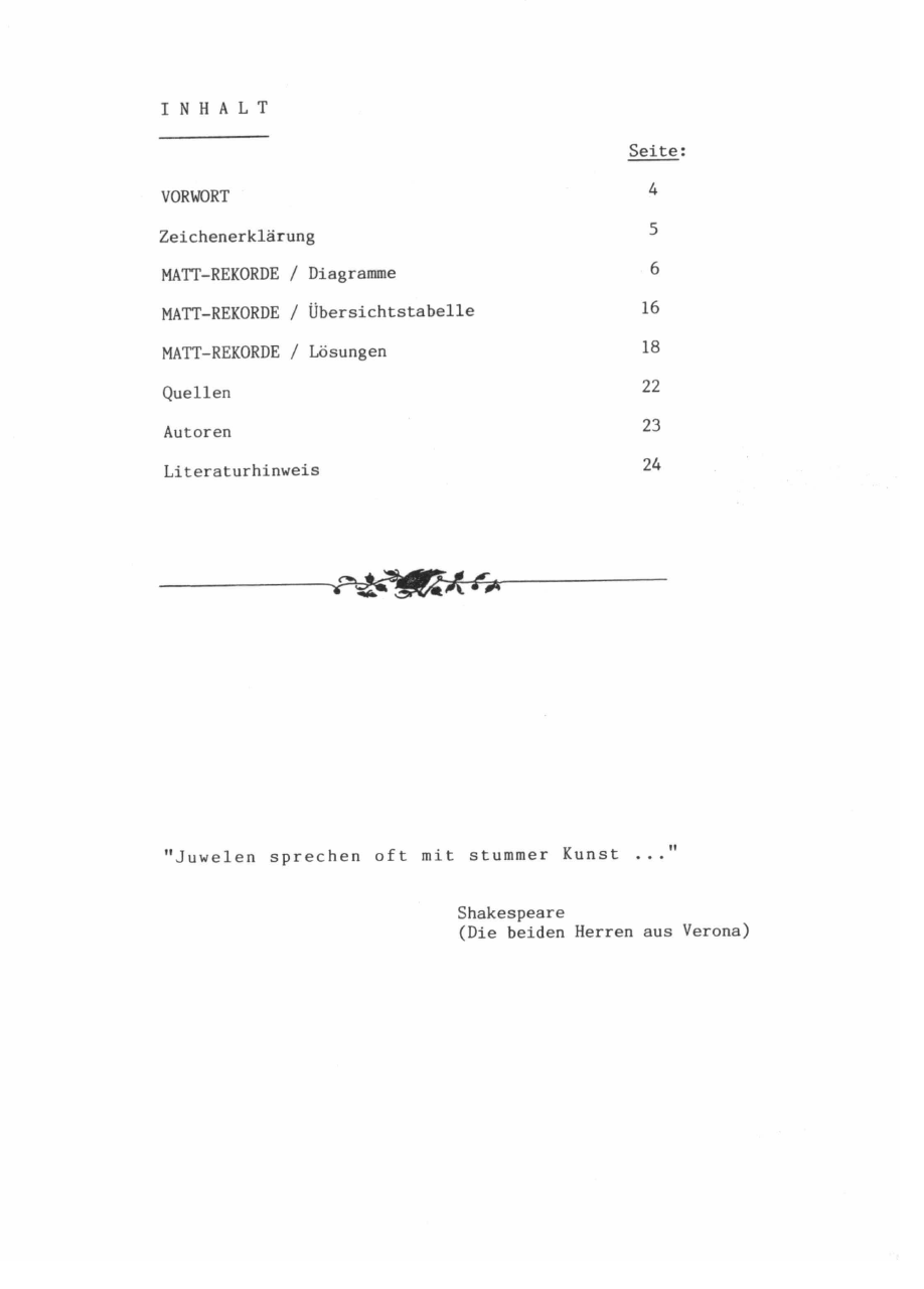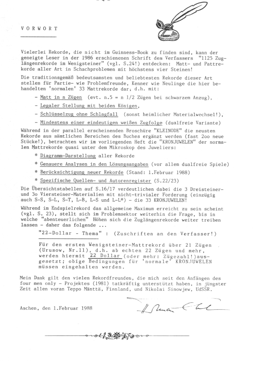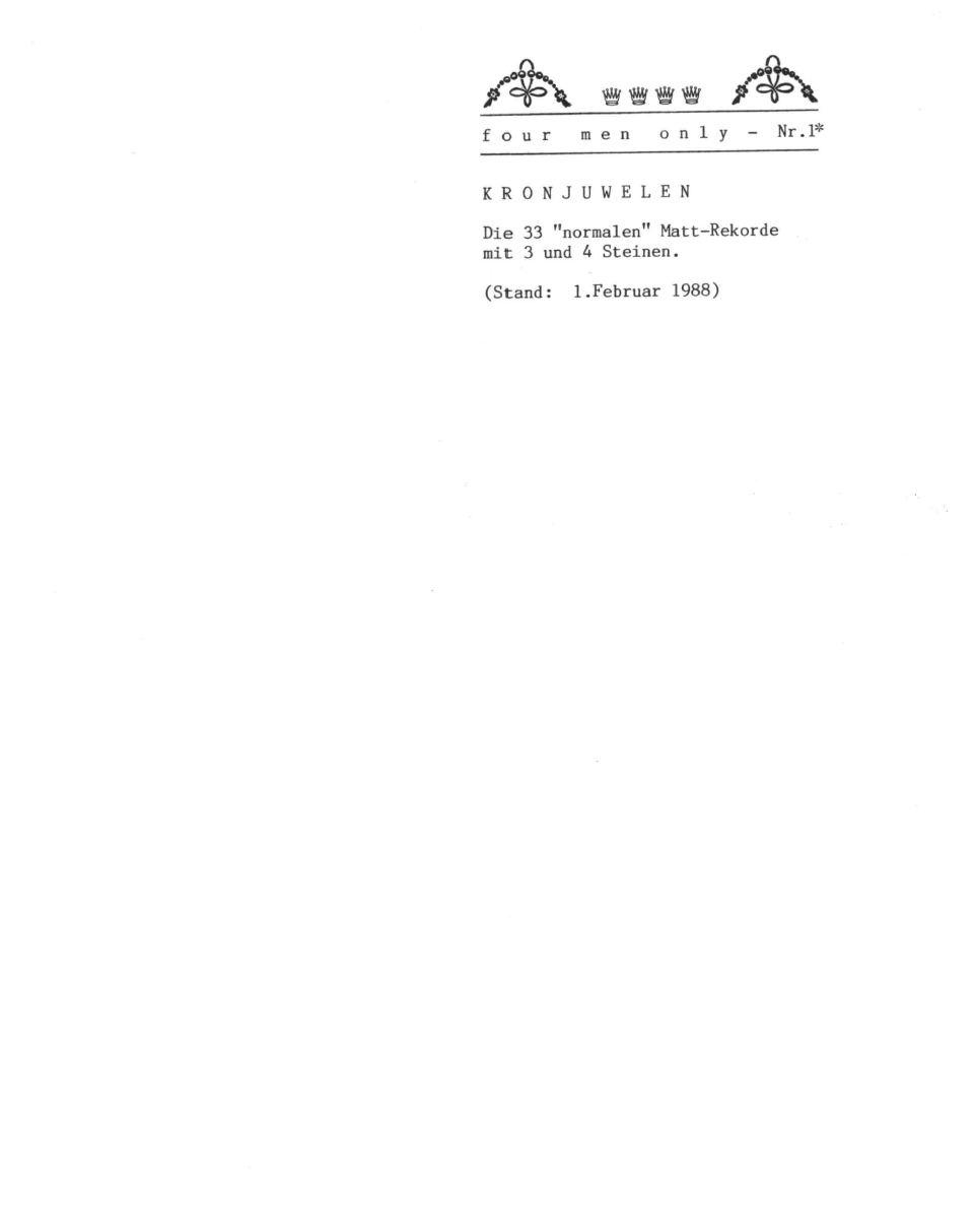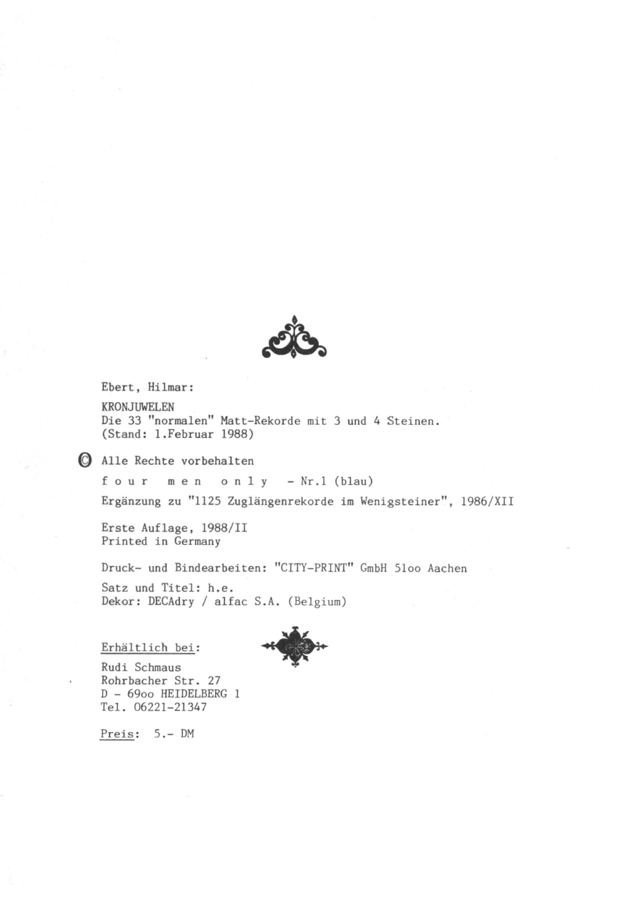 7) Kronjuwelen Die 33 'normalen' Matt-Rekorde mit 3 und 4 Steinen. (Stand: 1.Februar 1988); four men only, Nr.1* (blau) / Ergänzung zu "1125 Zuglängenrekorde im Wenigsteiner" (vgl. Nr. ); Aachen: four men only, 1988/II, 37 Diagramme, 2 Tabellen, 12 Urdrucke, 2 Register, 24 + IV S.