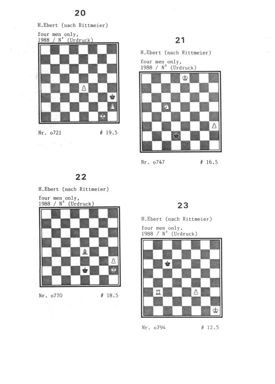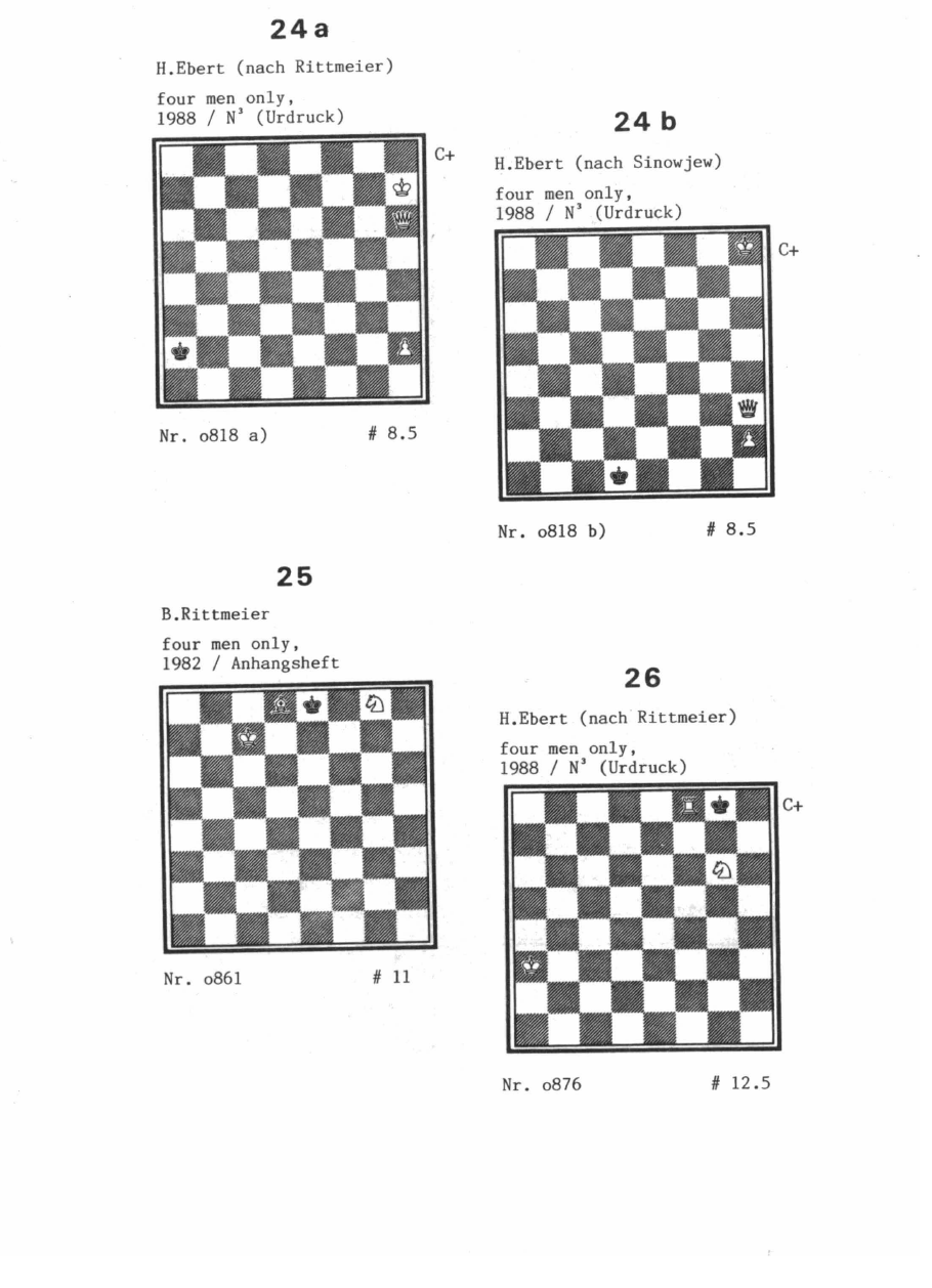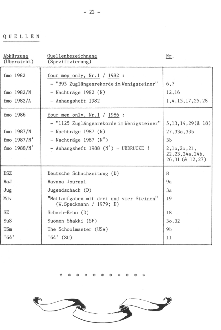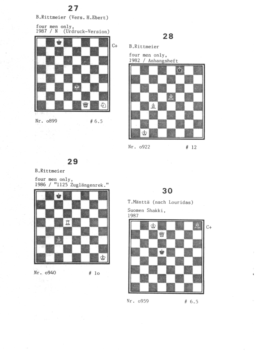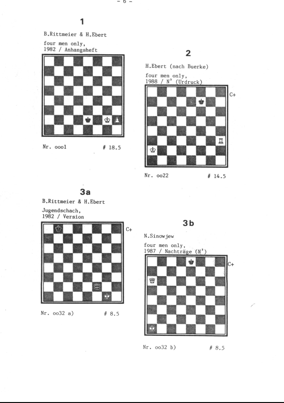 7) Kronjuwelen Die 33 'normalen' Matt-Rekorde mit 3 und 4 Steinen. (Stand: 1.Februar 1988); four men only, Nr.1* (blau) / Ergänzung zu "1125 Zuglängenrekorde im Wenigsteiner" (vgl. Nr. ); Aachen: four men only, 1988/II, 37 Diagramme, 2 Tabellen, 12 Urdrucke, 2 Register, 24 + IV S.