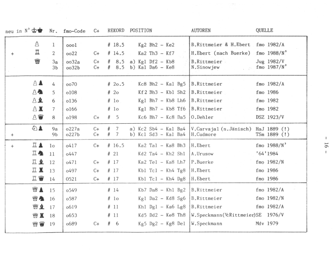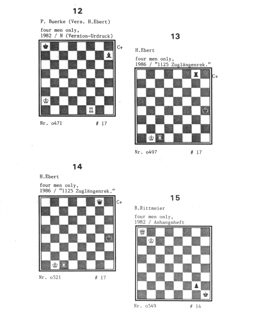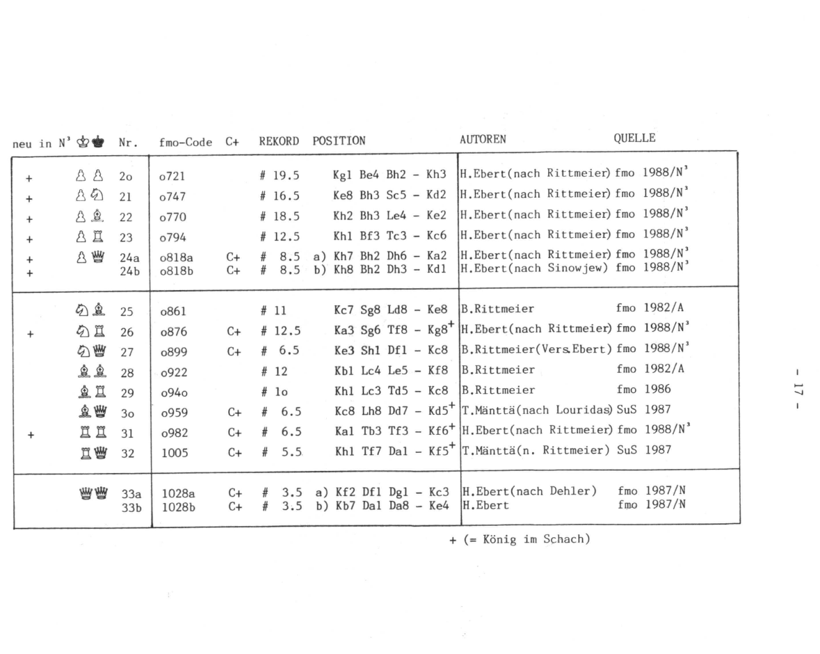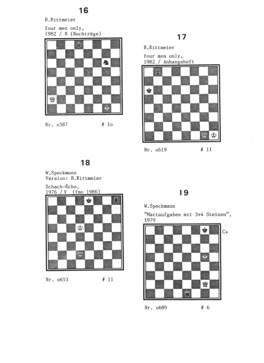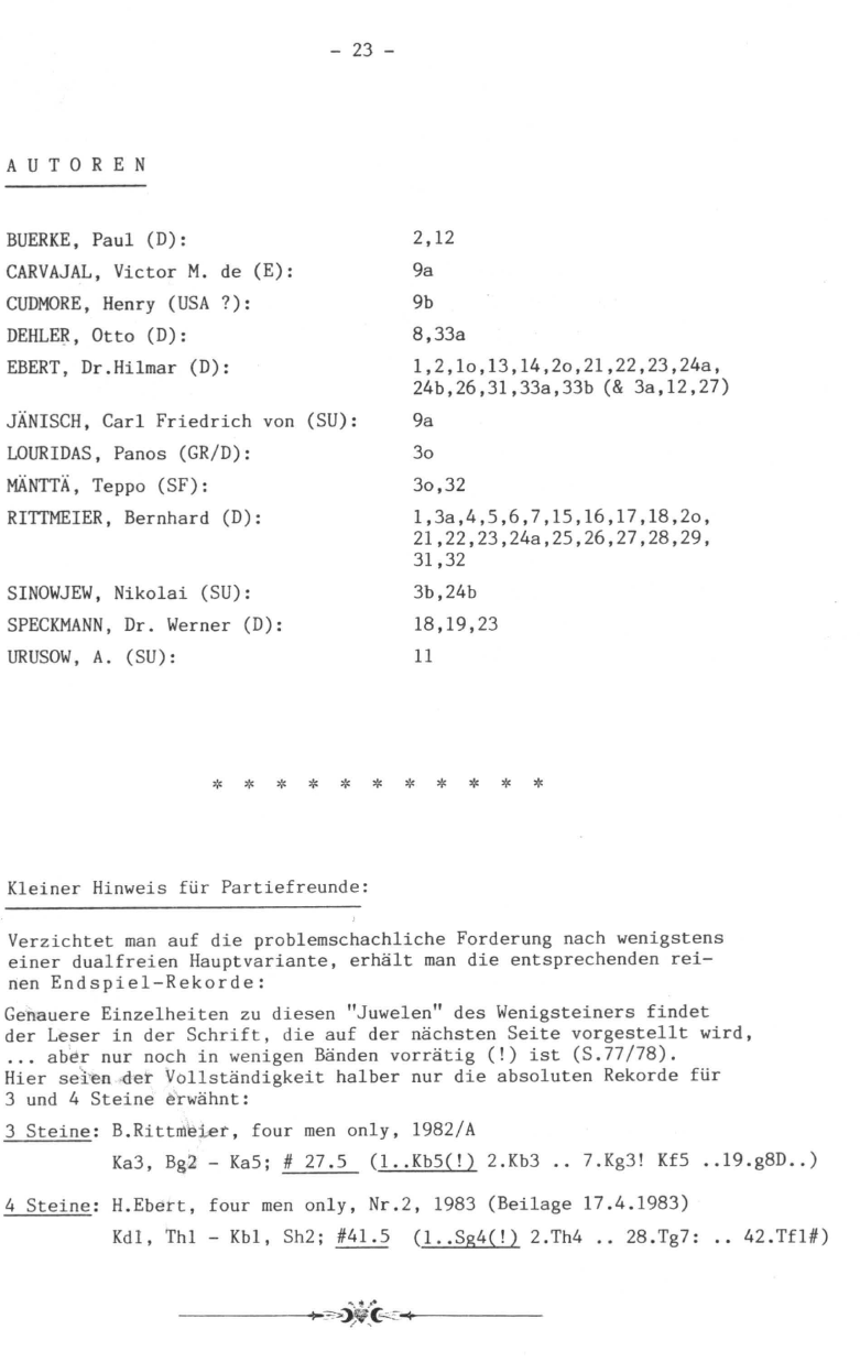 7) Kronjuwelen Die 33 'normalen' Matt-Rekorde mit 3 und 4 Steinen. (Stand: 1.Februar 1988); four men only, Nr.1* (blau) / Ergänzung zu "1125 Zuglängenrekorde im Wenigsteiner" (vgl. Nr. ); Aachen: four men only, 1988/II, 37 Diagramme, 2 Tabellen, 12 Urdrucke, 2 Register, 24 + IV S.