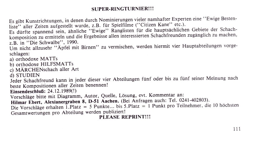 Um nicht allzusehr "Äpfel mit Birnen" zu vermischen, werden hiermit vier Hauptabteilungen vorgeschlagen: a) orthodoxe MATTS b) orthodoxe HILFSMATTS c) MÄRCHENSCHACH aller Art d) STUDIEN Jeder Schachfreund kann in jeder dieser vier Abteilungen fünf oder bis zu fünf seiner Meinung nach beste Kompositionen aller Zeiten benennen!