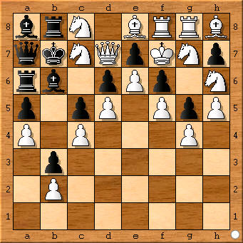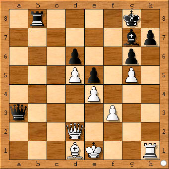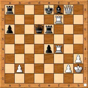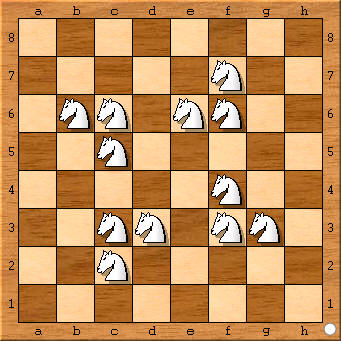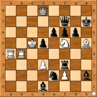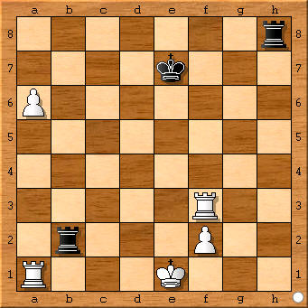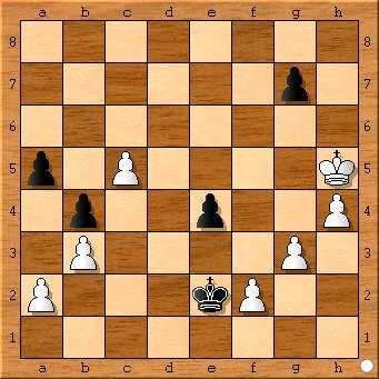Anmerkungen zu den Diagrammen: 1) 1.Tb7! Db7: 2.Lg6:+ Kg6: 3.Dg8+ Kf5: 4.Dg4+ Ke5 5.Dh5+ Tf5 6.f4+ Lf4: 7.De2:+ Le2: 8.Te4+ de4: 9.d4# 2) 1.Te6:+! Kh7 2.Dd3+ Tg6 3.Dg6:+ fg6: 4.Te7+ Kg8 5.Le6+ Kf8 6.Tf7+ Ke8 7.Sf6+ Kd8 8.Td7+ Kc8 9.Ta7:+ Kb8 10.Sd7+ Kc8 11.Sc5+ Kd8 1.Td7+ Kc8 1 13.Tf7+ Kd8 14.Sb7+ Ke8 15.Sd6:+ Kd8 16.Lb6# 3) 1.c6! Kf2: 2.c7 e3 3.c8D e2 4.Df5+ Kg1 5.De4 Kf2 6.Df4+ Kg1 7.De3+ Kf1 8.Df3+ Ke1 9.Kg4 Kd2 10.Dd5+ Kc1 11.Dc4+ Kd2 12.Dd4+ Kc1 13.De3+ Kd1 14.Dd3+ Kc1 15.De2: a4 16.Kf3 ab3: 17.ab3: Kb1 18.Ke3 g6 19.Kd3 g5 20.hg5: Ka1 21.Kc2 Ka2 22.Da6# 4) Nach 1.e4 Sf6 2.Sc3 d5 3.ed5: Sd5: 4.Lc4 Sb6 5.Lb3 c5 6.d3 Sc6 7.Sf3 e5 8.O-O Lg4 9.h3 Lh5 10.Se5:! Ld1: 11.Lf7:+ Ke7 12.Lg5+ Kd6 13.Se4+! Ke5: 14.f4+ Kd4 (14...Kf5?? 15.Sg3#) 15.Tad1: Ke3 16.Tf3+ Ke2 17.Td2+ Ke1 18.Tf1+ 5) Nach 43.Tcf7?? erfolgte 43...O-O-O! 44.g3 Lh6 und Weiß gab auf (43.g3!!). 6) 46.O-O! Tb2 47.Lc2 Lf8 48.Tf2 Le7 49.Kg2 Ld8 50.f4 Lb6 51.Tf3 La5 52.Df2 Dc5 53.fe5: Df2:+ 54.Tf2: de5: 55.Kh3 Lb6 56.Te2 Kf7 57.Kg4 Ke7 58.Ld3 Tb3 59.Lc2 Tc3 60.Th2 Kd6 61.Ld1 Tc7 62.Tc2 Lc5 63.Ta2 Ta7 endete die Partie remis. 7) 40.O-O-O! Ta2 41.Te1+ Kd7 42.a7 Ta8 43.Tf7+ Kd6 44.T1e7 Tc8+ 45.Kd1 Tc5 46.Td7+ Ke6 47.Th7 Tca5 48.Ke1 T5a4 49.Kf1 Ta1+ 50.Kg2 T4a3 51.The7+ Kf6 52.Tdb7 T3a2 53.Teh7 Ke6 54.Tb6+ Kd5 55.Th5+ Kc4 56.Tb7 Ta7: 57.Ta7: im 76. Zug remis gegeben). 8) Nur so! Sollen auch die Standfelder der Springer beherrscht werden, sind 14 Springer nötig (b6,c2,c3,c5,c6,d3,d5,e3,e5,f2,f3,f5,f6,g6) 9) Die Forderung nach 32 pattgesetzten Steinen gilt als unlösbar! |