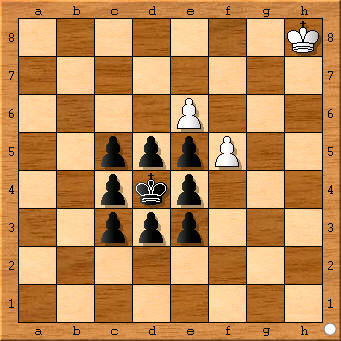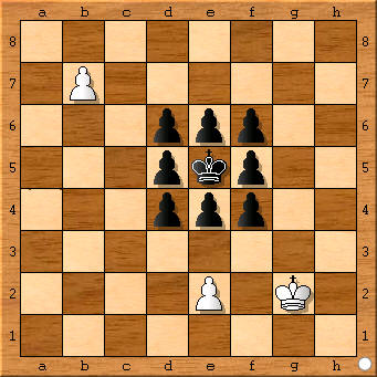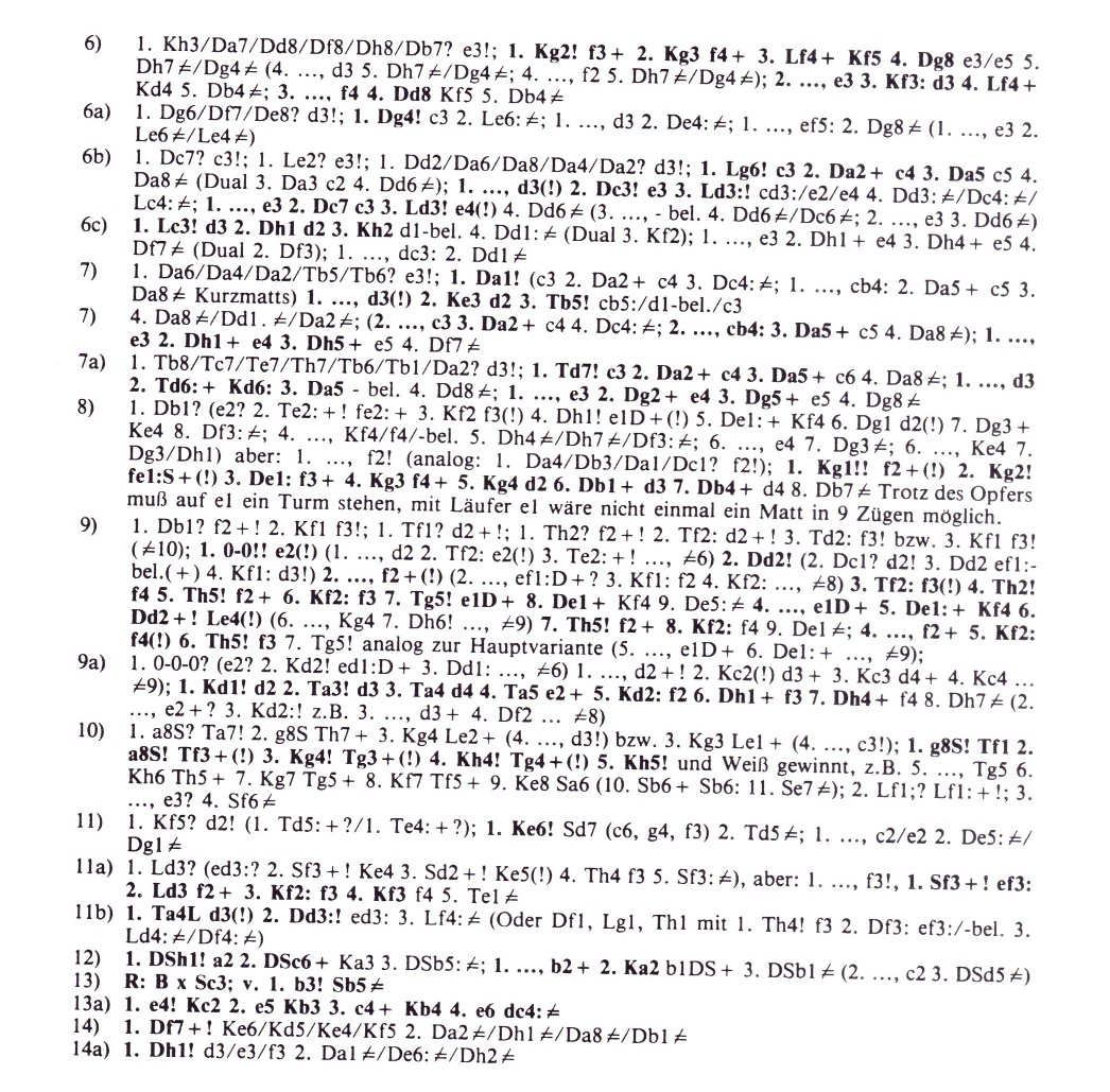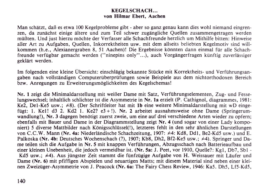 Man schätzt, dass es etwa 100 Kegelprobleme gibt – aber so ganz genau kann dies wohl niemand eingrenzen, da zunächst einige ältere und zum Teil schwer zugängliche Quellen zusammengetragen werden müssten. Und just hierzu möchte der Verfasser alle Schachfreunde herzlich um Mithilfe bitten: Hinweise aller Art zu Aufgaben, Quellen, Inkorkretheiten usw. mit dem allseits beliebten Kegelmotiv sind willkommen! Die Ergebnisse könnten dann einmal für alle Schachfreunde verfügbar gemacht werden („ninepins only“…), auch Vorgängerfragen künftig zuverlässiger geklärt werden. Im folgenden eine kleine Übersicht: einschlägig bekannte Stücke mit Korrektheits- und Verführungsangaben nach vollständigen Computerüberprüfungen sowie Beispiele aus dem nichtorthodoxen Bereich bzw. Anregungen zu Erweiterungsmöglichkeiten des Kegelschemas! Nr. 1 zeigt die Minimaldarstellung mit weißer Dame mit Satz-, Verführungselementen, Zug- und Fesselungswechsel; inhaltlich schlichter ist die Asymmetrie in Nr. 1a erzielt (P. Cathignol, diagrammes, 1981: Ke2, De1–Ke5 usw.; #8). (Der Schriftleiter hat mit Nr. 1b eine weitere Minimaldarstellung mit wD eingefügt: 1. Ke1! d3 2. Kd2 1. Ke2? e3+#!). Nr. 2 arbeitet ausnahmsweise ohne Dame (Springerumwandlung!); Nr. 3 dagegen benötigt zuerst zwei, um eine auf drei verschiedene Arten wieder zu opfern; ebenfalls mit Bauer und Dame in der Diagrammstellung zeigt Nr. 4 (und sogar von einer Lady komponiert) 5 diverse Mattbilder nach Königsschlüssel(!), letzteres fehlt in den sehr ähnlichen Darstellungen von C.C.W. Mann (Nr. 4a: Niederländische Schachzeitung, 1907: f4, Kd8, Dd1, Be2–Kd5 usw.) und E. Palkoska (Nr. 4b: Deutsches Wochenschach(?), 1907; Kb8, Dh2, Bf2–Ke5 usw.; #4). Springer und Dame teilen sich die Aufgabe in ... Nr. 5 mit reizvollen Verführungen, Abzugsschach nach Batterieaufbau und einer kleinen Unebenheit, die jedoch vermeidbar ist (Nr. 5a: J. Peet, vor 1910, Quelle: Kg1, Db7, Sbl–Kd5 usw.; #4). Aus jüngster Zeit stammt die fünfzügige Aufgabe von H. Weissauer mit Läufer und Dame Nr. 6 mit pfiffigem Abspiel und neuartigen Mattzügen; mit diesem Material sind neben einer kleinen Zweizüger-Asymmetrie von J. Peacock (Nr. 6a: The Fairy Chess Review, 1946: Ka5, Dh5, Lf5–Kd5 usw.; #2) auch Vierzüger bekannt (Nr. 6b: J. Peet, vor 1910: Kd7, Da5, Lh5–Kd5 usw.; #4 sowie Nr. 6c: A. Keller, vor 1910: Kg1, Dh5, Ld2–Kd5 usw.; #4, deren Duale dem Computerauge jedoch nicht verborgen blieben…). Dass auch mit Schwerfiguren eine Reihe von Mattbildeffekten erzielt werden können, bewies schon die frühe Nr. 7 sowie Nr. 7a von J. Peet (vor 1910: Ke8, Dd2, Tb7–Kd5 usw.; #4); immerhin dürfte sich gerade der schwerblütigere Turm besser zu langzügigen, komplizierteren Ideen eignen wie z.B. in Nr. 8 mit „Gabel-Wechsel“ oder in der bisher wohl zugänglichsten Aufgabe Nr. 9 – mit zugleich vermutlich der einzigen Ro- chade (im Schlüssel!) – während die große Rochade außer einer virtuellen Darstellung (Nr. 9a: H. Ebert, 200 ausgewählte Schachaufgaben, 1987: Ke1, Dg1, Tal–Ke4 usw.; #8) noch immer auf ihre Entstehung hofft! Lässt man weitere Steine bzw. auch schwarze Figuren zu, sind natürlich vielfältige Motive mit der Kegelromantik zu verknüpfen, sogar als Studie (Nr. 10) mit doppelter Springerumwandlung, im Zweizüger Nr. 11 mit pointierter Asymmetriebegründung oder in verspielten optischen Kleinigkeiten wie Nr. 11a (Kombination mit der „Home-Base“: H. Ebert, Stern, 1989: Ke1, Lf1, Sg1, Th1–Ke5; #5) und Nr. 11b (H. Ebert, „32–er“, 1987: Ke1, Dd1, Tal, Lc1–Ke5; #3). Zum Abschluss einige heterodoxe Ideen: Minimal mittels Märchen-Kombinationsstein in Nr. 12 (Amazone mit Entfernungsschlüssel!, in naturgemäß illegaler Stellung), Asymmetrie im Hilfsmatt nach Retro-Vorschaltzug in Nr. 13 (in einem gewöhnlichen Hilfsmatt – Nr. 13a – muss die Kegelstellung (Grenzfall!) erst einmal vervollständigt werden (T.R. Dawson, The Fairy Chess Review, 1949: Kd2, Bd3–Kd5, Bc5, c6, d4, d6, e5, e7; #4) sowie die diagonale Form des Kegelschemas in Nr. 14 (auch Horizontalzylinder mit Asymmetrie bereits in Nr. 14a: J. Peacock, FCR 1948, Ke7, De1, Tb5, h5, Le8–Ke5; #2). Sicher sind auch hier der Fantasie keine Grenzen gesetzt, Inhalte und Formen des Kegelschemas zu bereichern – neben den oben genannten Hinweisen zu bisher publizierten Kompositionen sind dem Verfasser auch Druckvorschläge für eine umfassendere Erörterung willkommen! Lösungen s. Scans!1 H. Ebert The Problemist 1987