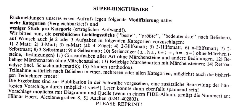 Teilnahme natürlich nach Belieben in einer, mehreren oder allen Kategorien, möglichst auch die bisherigen Teilnehmer erneut! Die Ergebnisse sind zur Publikation in der Schwalbe vorgesehen; eine zusätzliche Beurteilung der häufigsten Vorschläge durch möglichst viele Leser könnte dann ebenfalls spannend sein! Vorschläge möglichst mit Diagramm und Quelle (wenn in einem FIDE-Album, genügt die Nummer) an: Hilmar Ebert ... PLEASE REPRINT! |