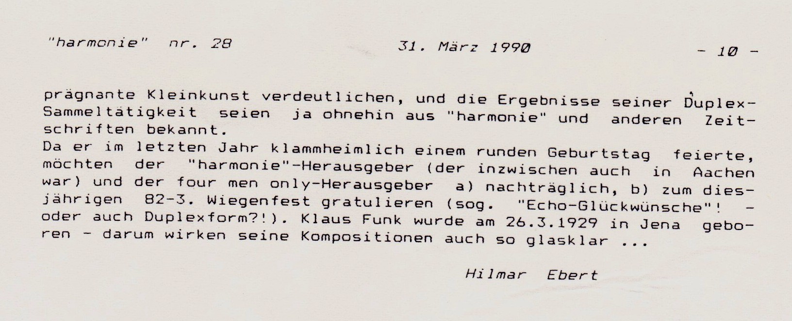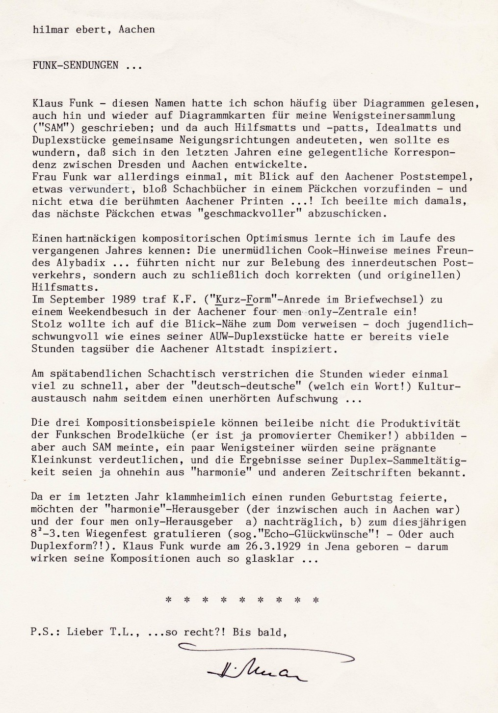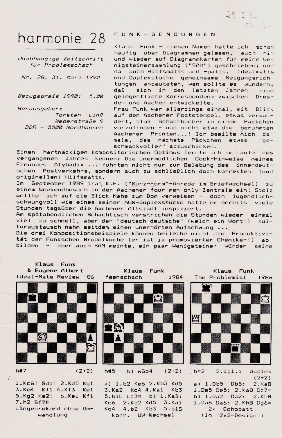 Klaus Funk – diesen Namen hatte ich schon häufig über Diagrammen gelesen, auch hin und wieder auf Diagrammkarten für meine Wenigsteiner-Sammlung („SAM“) geschrieben; und da auch Hilfsmatts, Patts, Idealmatts und Duplexstücke gemeinsame Neigungsrichtungen andeuteten, wen sollte es wundern, dass sich in den letzten Jahren eine gelegentliche Korrespondenz zwischen Dresden und Aachen entwickelte. Frau Funk war allerdings einmal, mit Blick auf den Aachener Poststempel, etwas verwundert, bloß Schachbücher in einem Päckchen vorzufinden – und nicht etwa die berühmten Aachener Printen… Ich beeilte mich damals, das nächste Päckchen etwas „geschmackvoller“ abzuschicken. Einen hartnäckigen kompositorischen Optimus lernte ich im Laufe des vergangenen Jahres kennen: Die unermüdlichen Cook-Hinweise meines Freundes Alybadix… führten nicht nur zur Belebung des innerdeutschen Postverkehrs, sondern auch zu schließlich doch korrekten (und originellen) Hilfsmatts. Im September 1989 traf K.F. („Kurz-Form“-Anrede im Briefwechsel) zu einem Wochenendbesuch in der Aachener four men only-Zentrale ein! Stolz wollte ich auf die Blick-Nähe zum Dom verweisen – doch jugendlich-schwungvoll wie eines seiner AUW-Duplexstücke hatte er bereits viele Stunden tagsüber die Aachener Altstadt inspiziert. Am späten Abend im Schachcafé verstrichen die Stunden wieder einmal zu schnell, aber der „deutsch-deutsche“ (welch ein Wort!) Kulturaustausch nahm einen unterhaltsamen Aufschwung. Die drei Kompositionsbeispiele können beileibe nicht die Produktivität der Funkschen Brodelküche (er ist ja promovierter Chemiker!) abbilden – aber auch SAM meinte, ein paar Wenigsteiner würden seine prägnante Kleinkunst verdeutlichen, und die Ergebnisse seiner Duplex-Sammeltätigkeit seien ja ohnehin aus „harmonie“ und anderen Zeitschriften bekannt. Da er im letzten Jahr klammheimlich einen runden Geburtstag feierte, möchten der „harmonie“-Herausgeber (der inzwischen auch in Aachen war) und der four men only-Herausgeber a) nachträglich, b) zum diesjährigen B2-3-Wiegenfest gratulieren (sog. „Echo-Glückwünsche“! – oder auch Duplexform?!). Klaus Funk wurde am 26.3.1929 in Jena geboren – darum wirken seine Kompositionen auch so glasklar… Hilmar Ebert