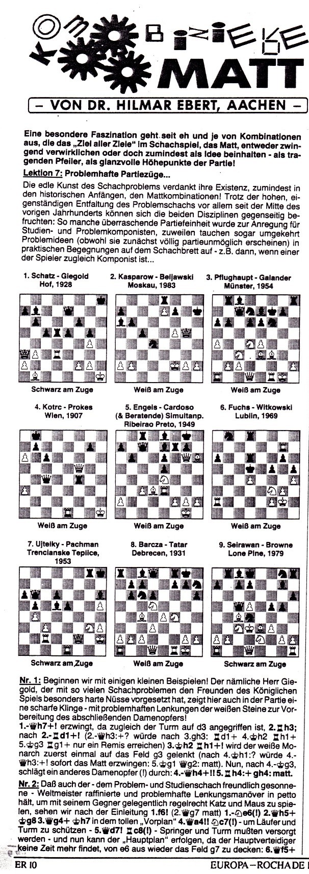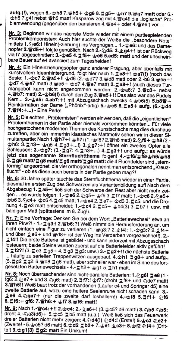 Nr. 2: Dass auch der - dem Problem- und Studienschach freundlich gesonnene - Weltmeister raffinierte und problemhafte Lenkungsmanöver in petto hält, um mit seinem Gegner gelegentlich Katz und Maus zu spielen, sehen wir nach der Einleitung 1.f6! (2.dg7 matt) 1.-se6 (!) 2.Dh5+ Kg8 3.Dg4+ Kh7 in dem tollen "Vorplan" 4.Da4!! sc7 (!) - um Läufer und Turm zu schützen - 5.Dd7! Tc8 (!) - Springer und Turm mußten versorgt werden - und nun kann der "Hauptplan" erfolgen, da der Hauptverteidiger keine Zeit mehr findet, von e6 aus wieder das Feld g7 zu decken: 6.Df5+ aufg. (!), wegen 6.-Kh8 7.Dh5+ Kg8 8.Tg5+ Kh7 9.Dg7 matt oder 6.-Kh6 7.g4! nebst Dh5 matt! Kasparow zog mit 4.Da4!! die "logische" Problemwendung (gegenüber den banaleren Gewinnzügen 4.De4+ oder 4.De6:) vor ...