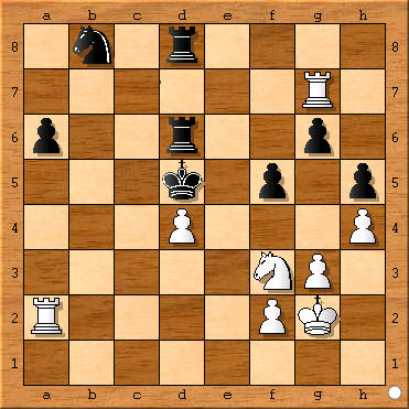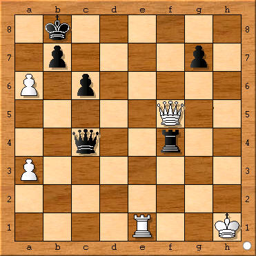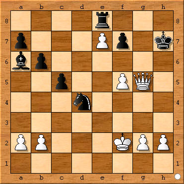 Nr. 4: Ein Hineinziehungsopfer ganz anderer Prägung, aber ebenfalls mit kunstvollem Ideenhintergrund, folgt hier nach 1.Te8+! Ka7 (!) (noch das Beste: 1.-Kc7 2.Da5+!! Kd6 [2.-Kd7? 3.Dd8 matt oder 2.-b6 3.De5+! Kd7 4.De7 matt] 3.De5+ Kd7 4.De7 matt) 2.Ta8+! [auch dieses Turmangebot kann nicht angenommen werden: 2.-Ka8:? 3.Dc8+ nebst 4.Db7: matt] 2.-Kb6 (!) durch den Zug 3.Da5+!! Das also war des Pudels Kern ...) 3.-Ka5: 4.ab7:+! mit Abzugsschach zwecks 4.Kb6 (5) 5.b8D+ Reinkarnation der Dame ("Phönix"-artig) 5.-Kc5 6.Ta5+ aufg. (6.-Kd4 7.Df4:+ ...) - eine Perle!