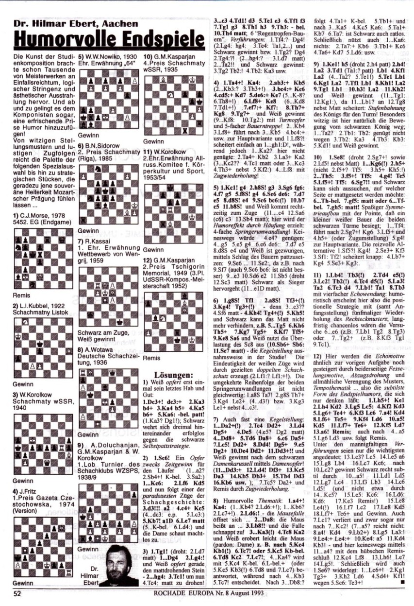 Die Kunst der Studienkomposition brachte schon Tausende von Meisterwerken an Einfallsreichtum, logischer Stringenz und ästhetischer Ausstrahlung hervor. Und ab und zu gelingt es dem Komponisten sogar, eine erfrischende Prise Humor hinzuzufügen! Von witzigen Stellungsmustern und lustigen Zugfolgen reicht die Palette der folgenden Spezialauswahl bis hin zu strategischen Stücken, die geradezu jene souveräne Heiterkeit Mozartscher Prägung fühlen lassen ... h.e./10.5.1993