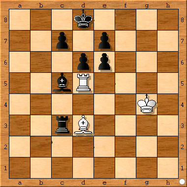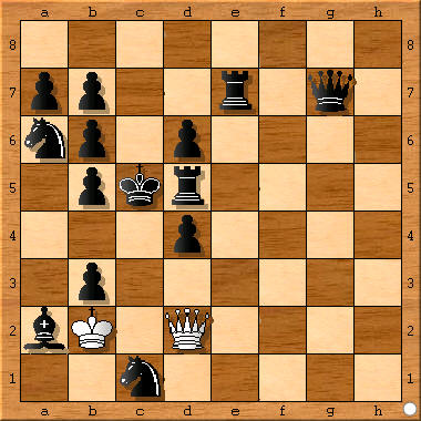 7) Auch fast eine Kegelstellung: 1...Da2+(!) 2.Tc4 Dd2+ 3.Ld4 Dg5+ 4.De5 (4.e5? Dg2 matt) 4...Dd8+ 5.Td6 Da8+ 6.c6 Da5+ 7.Lc5! Dd2+ 8.Dd4! Dg5+ 9.e5 Dg2+ 10.De4 Dd2+ 11.Dd3+!! und Weiß gewinnt nach dem schwarzen Damenkarussell mittels Damenopfer! (11...Dd3:+ 12.Ld4! Df3+ 13.Kc5 Da3 14.Kb5 Db3+ 15.Tb4 Dd3 16.Kb6 usw. ); 7.Tc5? Da2+ und Remis durch Zugwiederholung.