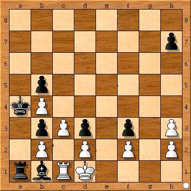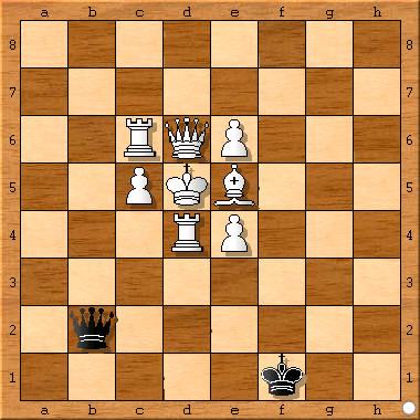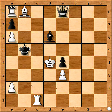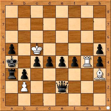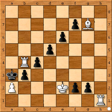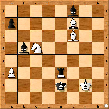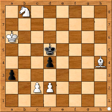 2) 1.Sc6! Ein Opfer zwecks Zeitgewinn für den Läufer (1...a2? 2.Bb4+! K-bel. 3.Ba2:) 1...Kc6: 2.Lf6 Kd5 und nun folgt einer der paradoxesten Züge der Schachgeschichte: 3.d3!!! a2 4.c4+ Kc5 (4...dc3: e.p. 5.Lc3:) 5.Kb7! a1D 6.Le7 matt (5...K-bel. 6.Ld4:) und die Dame schaut machtlos zu.