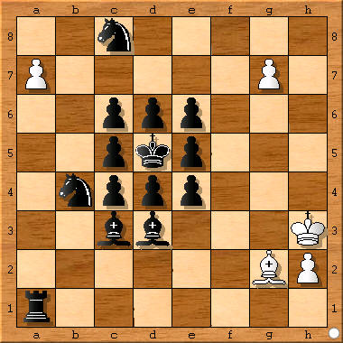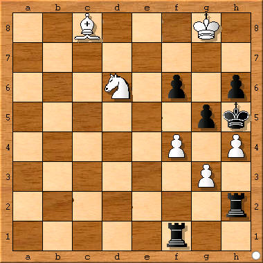 5) 1.Kc1! g4 2.h8S! g3 3.Sg6 fg6: 4.f7 g5 5.f8S! g4 6.Se6 de6: 7.d7 e5 8.d8S! e4 9.Sc6 bc6:(!) 10.b7 c5 11.b8S! und Weiß kommt rechtzeitig zum Zuge (11....c4 12.Sa6(c6) c3 13.Sb4 matt); hier wird der Humoreffekt durch Häufung erzielt: 4-fache Springerumwandlung! Keineswegs würde 4.e4? genügen: 4...g5 5.e5 g4 6.e6 de6:: 7.d7 e5 8.d8S e4 und Weiß ist gezwungen, mittels Schlag des Bauern pattzusetzen: 9.Se6 ... 11.Se2:, da z.B. nach 9.Sf7 (auch 9.Sc6 bc6: ist nicht besser) 9...e3 10.Sd6 e2 11.sb5 (droht 12.sc3 matt) Schwarz als Sieger hervorgeht (11...e1D matt).