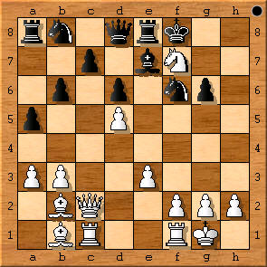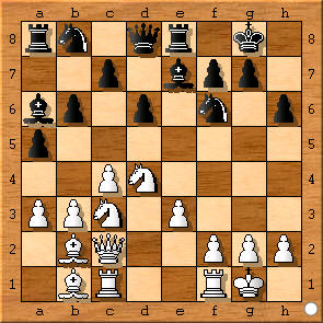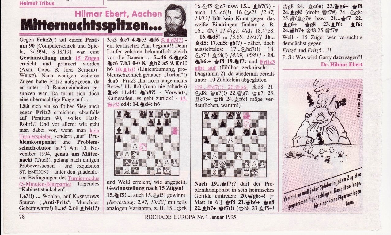 Gegen Fritz2 (!) auf einem Pentium 90 [® Computerschach und Spiele, 3/1994, S.18/19] war eine Gewinnstellung nach 15 Zügen erreicht und prämiert worden (Axel Caro & Jens Schmidt-Wilke). Nach wenigen weiteren Zügen hatte Fritz2 aufgegeben, da er unter -10 Bauerneinheiten gesunken war. Da türmt sich doch eine übermächtige Frage auf ... Lässt sich ein so früher Sieg auch gegen Fritz3 erreichen, ebenfalls auf Pentium 90, volles Hash-Rohr!?! Und vor allem: wie geht man dabei vor, wenn man kein Turnierspieler, sondern „nur“ Problemkomponist und Problemschach-Autor ist?!? Am 10. November 1994, genau um Mitternacht (Titel!), gelang nach einigen Probeversuchen - und exquisiten St. Emilions - unter den gnadenlosen Bedingungen des Turniermodus (5-Minuten-Blitzpartie) folgendes „Kabinettstückchen“: 1.e3(!) ... Wohlan, auf Kasparows Spuren („Anti-Fritz“, Münchner Geheimwaffe!) 1... e5 2.c4 Lb4(!?) 3.a3 Le7 4.Sc3 Sf6 5.Ld3!?! - ein teuflischer Plan beginnt!! Denn Läufer gehören bekanntlich gleich vor die Bauern ... 5...d6 6.Sge2 Sc6 7.b3 0-0 8.Lb2 a5 9.Tc1! b6 10.Lb1! (Linienräumung, problemschachlich genauer: „Turton“!) La6 - Fritz3 ahnt noch lange nichts Böses! 11.0-0 (kann nie schaden) Te8 11.d4! Sb8?! - Vorwärts, Kameraden, es geht zurück! - 12.Dc2! ed4: 14.Sd4: h6 (vgl. Diagramm 1):