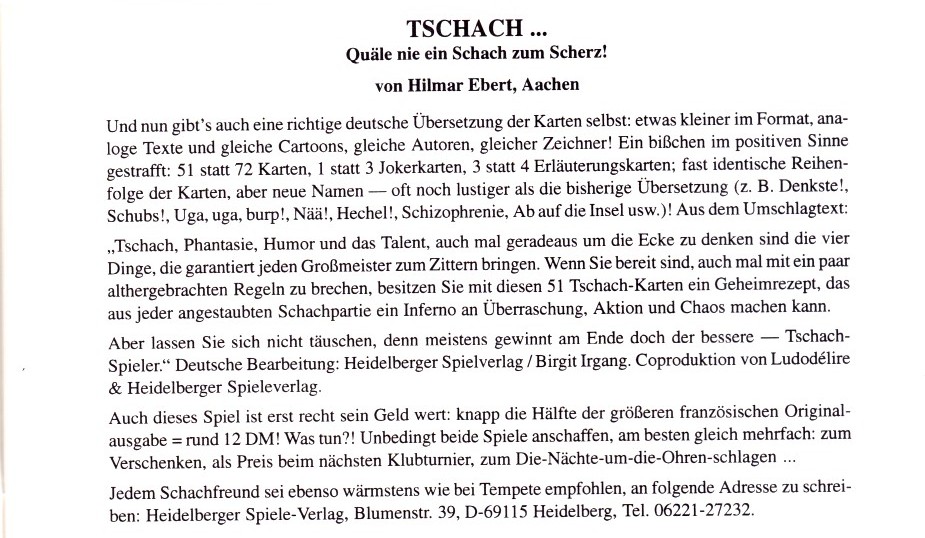 Und nun gibt’s auch eine richtige deutsche Übersetzung der Karten selbst: etwas kleiner im Format, analoge Texte und gleiche Cartoons, gleiche Autoren, gleicher Zeichner! Ein bißchen im positiven Sinne gestrafft: 51 statt 72 Karten, 1 statt 3 Jokerkarten, 3 statt 4 Erläuterungskarten; fast identische Reihenfolge der Karten, aber neue Namen - oft noch lustiger als die bisherige Übersetzung (z. B. Denkste!, Schubs!, Uga, uga, burp!, Nää!, Hechel!, Schizophrenie, Ab auf die Insel usw.)! Aus dem Umschlagtext: „Tschach, Phantasie, Humor und das Talent, auch mal geradeaus um die Ecke zu denken sind die vier Dinge, die garantiert jeden Großmeister zum Zittern bringen. Wenn Sie bereit sind, auch mal mit ein paar althergebrachten Regeln zu brechen, besitzen Sie mit diesen 51 Tschach-Karten ein Geheimrezept, das aus jeder angestaubten Schachpartie ein Inferno an Überraschung, Aktion und Chaos machen kann. Aber lassen Sie sich nicht täuschen, denn meistens gewinnt am Ende doch der bessere - Tschach-Spieler.“ Deutsche Bearbeitung: Heidelberger Spielverlag / Birgit Irgang. Coproduktion von Ludodélire & Heidelberger Spieleverlag. Auch dieses Spiel ist erst recht sein Geld wert: knapp die Hälfte der größeren französischen Originalausgabe = rund 12 DM! Was tun?! Unbedingt beide Spiele anschaffen, am besten gleich mehrfach: zum Verschenken, als Preis beim nächsten Klubturnier, zum Die-Nächte-um-die-Ohren-schlagen ... Jedem Schachfreund sei ebenso wärmstens wie bei Tempete empfohlen, an folgende Adresse zu schreiben: ® Heidelberger Spiele-Verlag, Blumenstr. 39, D-69115 Heidelberg, ( 06221-27232.