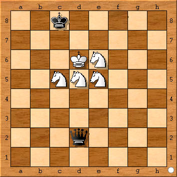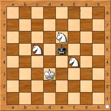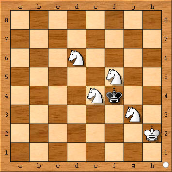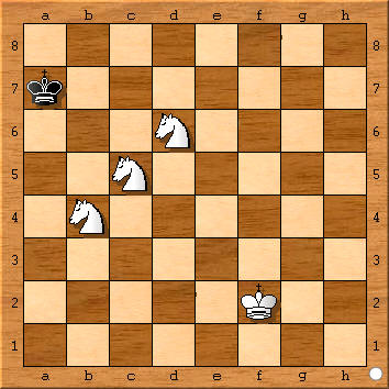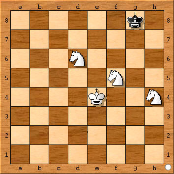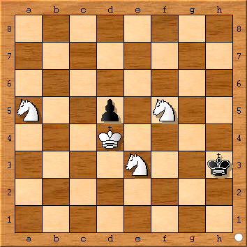 a: 1.Sc4! Dh2+ 2.Kc6 Kb8 3.Sd6! Dc2 4.Sb4 und gewinnt. [Fritz-3: 9.44, 11/11] Als Strategie zeigt sich eine Wanderbewegung um eine Reihe nach links. Chéron bemerkte lapidar, dass Troitzky gezeigt habe, dass 4 Springer allgemein(!?) gegen die Dame gewinnen würden. C* deutet die Computerprüfung für Studien mittels Fritz-3 an, unter Angabe der Bewertungszahl und der Rechentiefe. Auch Alybadix-1994 findet [auf Pentium-90 unter Nutzung von 15 MB Hash-Tables, in Sidebadix mit F=2] nach dem ersten Zugpaar 2.Kc6! als #10(!) - in 5 Minuten! b: 1.Se4! Kf5 2.Ke3 Ke5 3.S6g5 Kf5 4.Sf3 Kg4 5.Sd4 Kh4 6.Sf5+ Kg4 7.Sg7 Kh4 8.Kf2 Kg4 9.Sg6 Kh3 10.Sf6 Kh2 11.Sf4 Kh1 12.Sf5 Kh2 13.Sg4+ Kh1 14.Sg3# (Viele Duale, nicht nur am Ende der Lösung im 10.-12.Zug, auch 7...Sg3 und 3.Sf8/Sd8 u.a.) - dennoch ein vielzitierter Klassiker!). Nr. 1: 1.Sc6? Kd7!; 1.Sg6? Kd8!; 1.Se6? Ke7!; 1.Sd5? Kd8!; 1.Kf6! Kd8 2.Se6+ Kc8 3.Sd6+ Kb8 4.Sc6+ Ka8 5.Sc7# (2...Ke8? 3.Sd6#); 1...Kf8 2.Se6+ Kg8 3.Kg6 Kh8 4.Sf7+ Kg8 4.Sf6# (2...Ke8? 3.Sd6#) Nr. 2: 1.Sc2? Kb3:!; 1.Sc3? Ka3!; 1.Kd3! Wartezug; 1...Kb1 2.Kc3 Ka2 3.Sc2 Kb1 4.Sa3+ Ka2 5.Sc1#; 1...Ka2 2.Kc3 Kb1 3.Sc2 Ka2 4.Sb4+ Kb1 5.Sa3# Nr. 3: 1.Sd7! Ka8 2.Ke3 Ka7 3.Kd4 Ka8 4.Kc5 Ka7 5.Sc6+ Ka6/Ka8 6.Sdb8#/Sdb6#; Matt mit und ohne Königsbeteiligung, Asymmetrie. Ein Zug länger, ohne Duale, wenn auch etwas auf Kosten des Schlüssels. Nr. 4: Knappe Verführung: 1.Kf4?! Kf8?/Kh7? 2.Kg5! ~ 3.Kh6 Kf8(h8)/Kg8 4.Sg6+/Se7+ Kg8/Kf8(!) 5.Sfe7#/Sg6#, aber: 1...Kh8!!; 1.Sg6! Kh7 2.Sge7 Kh8 3.Se8 Kh7 4.Sf6+ Kh8 5.Sg6# Erstmals genügen 3 Springer alleine ohne Königsbeteiligung (#5)! Nr. 5: 1.f6? Kg6:!; 1.Sde5! Kg7(!) (1...Kg8? 2.f6 Kh7 3.f7 Kh6 4.f8D+ bzw. 1...Kh6? 2.f6 Kh5 [2...Kh7 3.f7] 3.f7 Kh6 4.f8D endet mit Kurzmatt im 5. Zug); 2.f6+ Kh6 3.f7 Kh5 4.f8T! Kh6 5.Tf7 Kh5 6.Th7#; Turmumwandlung, Asymmetrie. Wer möchte, kann auch einen weißen König auf b1 sowie einen schwarzen Läufer auf a1 und einen schwarzen Bauern auf b2 hinzufügen. Nr. 6: I) 1.Sc3+! Ke3 2.h5 Kd2 3.h6 Ke3 4.h2 Kd2 5.h8D Ke3 6.Dh6#; II) 1.Sc5+! Ke5 2.h5 Kd6 3.h6 Ke5 4.h7 Kd6 5.h8S! (h8D?) Ke5 6.Sf7#; Das beste Stück des dortigen Artikels. Nr. 7: a) 1.Sb2? Ke3!; 1.Sdf2! Ke3 2.Kg3 Ke2 3.Te1#; b) 1.Se3! Kd3 2.Sf2+ Ke2 3.Sh3 Kd3 4.Kg3 Ke4/Ke2 5.Sf2#/Sf4# Quasi-Echo. c) 1.Sdf2! Ke3 2.Kg3 Ke2 3.Kf4 Kf1 4.Ke3 Kg2 5.Sd2! Kg1 6.Kf3 Kh2 7.Sg3 Kg1 8.Se2+ Kh2 9.Sf1#; 5...Kh2 6.Kf3 Kg1 7.Sg3 Kh2 8.Sdf1 Kg1 9.Sh3# ; Ein ungewöhnlicher Drilling. Nr. 8: 1.Se7?/Sh4?/Sf4? Sd7+!; dualfrei: 1.Sf6! Sg6+ 2.Kf7 Sh4 3.Se7 ~ 4.Sg6#; 2...Se7 3.Sh4! ~ 4.Sg6#; Autor: 2...Se7 3.Ke8 ~ 4.Sf7#; 1...Sd7+ 2.Kf7! Se5+ 3.Ke8/Ke6 Dual; 2...Sf6: 3.Se7/Sh4; 2...Sf8 3.Sh4/Se7 ... Nr. 9: 1.Sa2? Kb1? 2.Sdb4! Kb2 3.Sc3 und 6#, aber: 1...Kd1!; 1.Sa4(e4,e2)? Kb1? 2.Sd4! und 5#, aber: 1...Kd1!; 1.Sd5!! Kd1(!) (1...Kb1? 2.Sd4! #5) 2.Kc3!! Ke2 (2...Ka1 3.Kb3(4) ~ 4.Sc3+ nebst 5#) 3.Sd4+ Kf1 4.Se3+ Kg1 5.Sf3+ Kh1 6.Sf2#; → Maximale Entfernung der Mattecke: 5 Felder statt 2 am falschen Rand! Überraschenderweise Matt ohne den weißen König, nur durch die drei weißen Springer! Plus ein bisschen Ornamentik: die 3 Springer bilden wie in der Diagrammstellung nach 3.Sd4+ und nach 5.Sf3+ jeweils eine Linie (90° und 180° gedreht gegenüber der Diagrammstellung). Nur ein Löser, Frank Visbeen aus den Niederlanden (unter der geballten Löse-Weltelite im Andernacher Löseturnier) schaffte es, die Aufgabe innerhalb von 24 Stunden zu lösen! Nr. 10: 1. Sc6! Kh2 2.Se5 Kh3(!) 3.Sd3! (3.S5g4? patt!) Kh2 4.Sf2! (verhindert das Patt!) Kg1 5.Sfg4 Kh1 6.Sh4 Kg1 7.Sf3+ Kh1 8.Sf2#. Eine schlackenlose - dualfreie und variantenfreie! - achtzügige Hauptvariante (denn 2...Kg1? 3.S5g4 Kh1 4.Sh4 Kg1 5.Shf3 Kh1 6.Sf2# oder 2...Kh1? 3.S5g4 Kg1 4.Sfh4 Kh1 [oder 4./5. Zug vertauscht] 5.Kd5: Kg1 6.Sf3+ Kh1 7.Sf2# enden je mit Kurzmatt nach „schlechter“ Verteidigung!). Die drei Musketiere erledigen die Arbeit ohne den König - in Rekordlänge! Der Sc6 zieht 5 mal in Folge, dabei zeichnet er ein Sternbild - erkannt?! Die pattvermeidende Umgehung erzeugt den Großen Wagen (oder: Großen Bären)! Nr. 11: 1.Sfe6+?/1.Se4? (1...Kg8?) 1...Ke8!; 1.Sfg6+! Ke8 2.Sd6+ Kd8 3.Se6#; 1...Kg8 2.Se4 Kh7 3.Sf6# Asymmetrie. Nr. 12: 1.Sd6-f7? (1...Kg4?) 1...Kf3! (2.Seg5? Kf2!) 1.Sc4! (Schwarz beliebig, dualfrei z. B. nach:) 1...Kg4(!) 2.Sfe3+! Kf3(f4,h4) 3.Sg2 Kg4 4.Se5# Nr. 13: 1.Sbd5! Kg7 2.Se6! Kh6 3.Sf5 Kh7 4.Sf6! Kh8 5.Sg6#; 3..Kh5 4.Sf6; 2...Kh7 3.Sf6 Kh7/Kh6 4.Sf7#/Sf5(7)#; 2..Kh8 3.Sf7 kh7 4.Sf6#; Auch ein =3 mit dreifachem Echo liegt vor (1.Sb4-d5! Kg7 2.Sc5-e6+ Kh8/Kh7/Kh6 3.Sd5-f6=/Sf7=/Sf6=). Nr. 14: 1.Se2? Ke2!, !:Sc5? Kd2!; 1.Sf4? Kd2!; 1.Sb4? Kd2! ; 1.Sb3! Ke2 2.Kc5! Ke3 2.Sd4 Ke4 4.Sf2+ Ke3 5.Sc4# (3...Kd2 4.Sf2 Kc3/Ke3 5.Se4#/Sc4#); 2...Kd1 3.Sd4 Kd2 4.Sf2 Kc3/Ke3 5.Se4#/Sc4#, 2...Kf1 3.Shf4 Kg1 4.Sf3+ Kf1/Kh1 5.Sd2+/Sf2#, Dualfreie Abspiele. Nr. 15: 1.Sde3?/1.Sc3+? Kd3!; 1.Se5?/Se1? Kd1:!; 1.Sfe3! Kd3 2.Shf2+ Ke2 3.Sh3 Kd3 4.Kg3 Ke4/Ke2 5.Sf2#/Sf4#; → Nr. 7! Nr. 16: a) I) 1.S5d6! Kc6/Ke6 2.Ke4 Kd7 3.Kd4! Kc6/Ke6 4.Sde5#/Sc5#; II) 1.Sd4! Ke8 2.Sde5 Kf8 3.Se6+ Kg8/Ke8 4.Sf6#/Sd6# (1...Kc8 2.Sc5 Kb8 3.Sc6+ Kc8/Ka8 4.Sd6#/Sb6/Sc7#; b) I) 1.S7a6! Kb6 2.S5c4+ Kc6 3.Sc2! Kd5/Kb5 4.Scb4#/Sd4# (2...Ka7 3.Sb5+ Ka8 4.Sb6#; 1...Ka8 2.S5c4/S3c4 ...); II) 1.Sa4! Kb8 2.Sb5 Kc8 3.Sb6+ Kd8/Kb8 4.Sc6#/Sag6# Nr. 17: 1.g4! ... 5.g8S! K~ 6.Se7# Springer-Umwandlung. Nr. 18: 1.Sg3-f5? Kg4!; 1.Sgh5! Kg2 2.Sde1+ Kf1/Kh1:/Kh3 3.S5g3#/Sg3#/Sf2#; 1...Kg4 2.Sde5+ Kf5/Kh5:/Kh3 3.S1g3#/Sg3#/Sf4#; 3 Echopaare! Der Klassiker für „vier Richtige mit Zusatz“! Nr. 19: 1.Sba2! Sc2:+ 2.Kc5 S~ 3.Sd4(:)#; 1...Kc2: 2.Kd5 Kb3/Kd3/Sb3 3.Sb4#