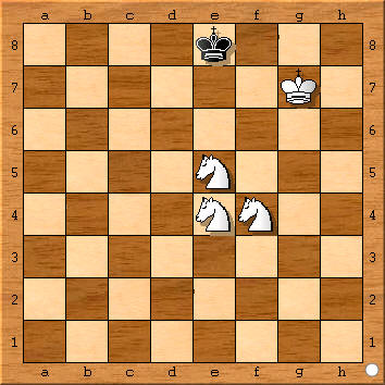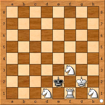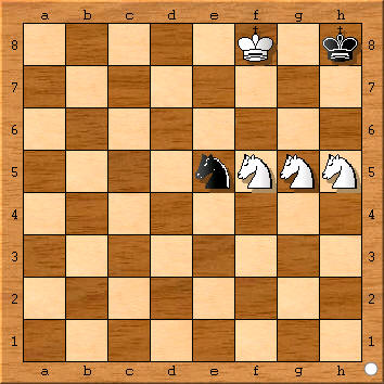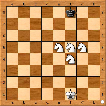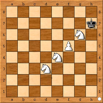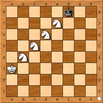 Unter dem Titel „Pferdestärken“ hatte ich zum Schwalbe-Treffen 1990 in Lüneburg in der gleichnamigen Festschrift, die liebevoll von Winfried E. Kuhn herausgegeben wurde, einen kleinen Grußartikel über Aufgabenbeispiele vorgestellt (S. 345-350), die in der Diagrammstellung mindestens 3 weiße Springer enthalten; nicht mehr berücksichtigt seien Aufgaben, in denen der dritte weiße Springer erst im Verlauf der Lösung umgewandelt wird (z. B. Hilmar Ebert, Lüneburger Landeszeitung, 10.2.1990: Ka8 Sb3 Sf7 ba7 - Kd3 Sc5 Se6, h#3 C+: 1.Se4! Kb7 2.Kc4 a8S! 2.Kd5 Sb6# vgl. auch → R. Brieger, 3405. Schach-Echo, 8.11.1963: Ke2 Se6 be7 - Ke5 Sd5 Sd7, h#2: 1.Ke4! e8S 2.Se5 Sd6#). Inzwischen sind offenbar eine Reihe weiterer Probleme dieser Art erschienen, so dass der einstigen Anregung nunmehr eine etwas umfassendere Untersuchung folgen soll. Zum Auftakt eine Studie und ein Problem, das im heutigen Sinne ebenfalls eher den Charakter einer Studie besitzt, da allzu freizügig mit Dualen verfahren wird: Im Hauptteil zeigen Nr. 1-29 orthodoxe Mattprobleme, es folgen orthodoxe Hilfsmatts (Nr. A-G), wobei noch unterschieden werden muss, ob pure Mehrspringerdarstellungen vorliegen oder weitere Figuren und Bauern verwendet werden.