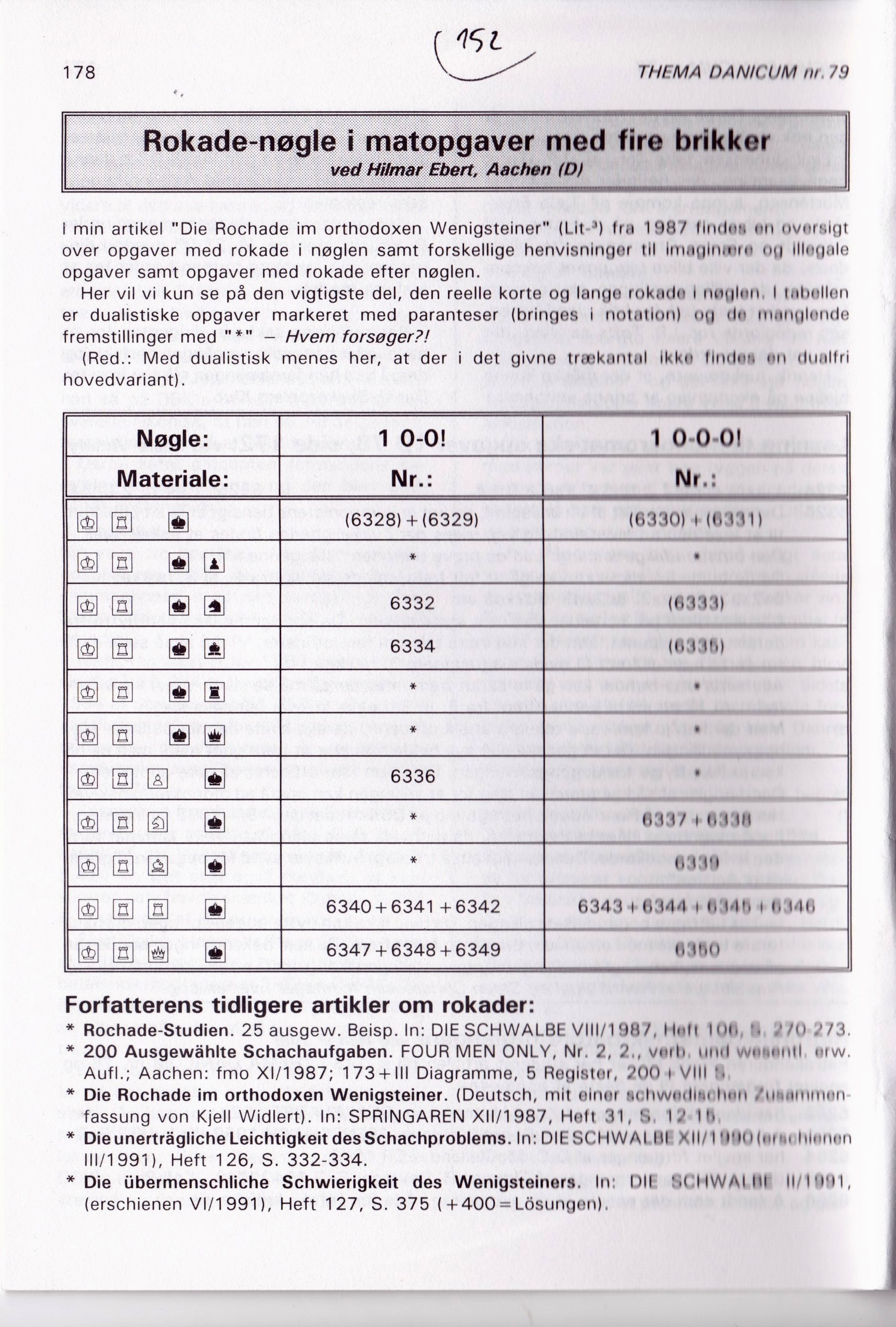 Schriften des Verfassers zur Rochade: ¨ Rochade-Studien. 25 ausgew. Beispiele. in: Die Schwalbe VIII/1987, Heft 106, S. 270 - 273 ¨ 200 Ausgewählte Schachaufgaben. four men only, Nr. 2, 2., verb. und wesentl. erw. Aufl.; Aachen: fmo XI/1987; 173 + III Diagramme, 5 Register, 200 + VIII S. ¨ Die Rochade im orthodoxen Wenigsteiner. (deutsch, mit einer schwedischen Zusammenfassung von Kjell Widlert) in: Springaren XII/1987, Heft 31, S. 12 - 15 ¨ Die unerträgliche Leichtigkeit des Schachproblems. in: Die Schwalbe XII/1990 (erschienen III/1991), Heft 126, S. 332 - 334 ¨ Die übermenschliche Schwierigkeit des Wenigsteiners. in: Die Schwalbe II/1991, (erschienen VI/1991), Heft 127, S. 375 [+ 400 = Lösungen] |