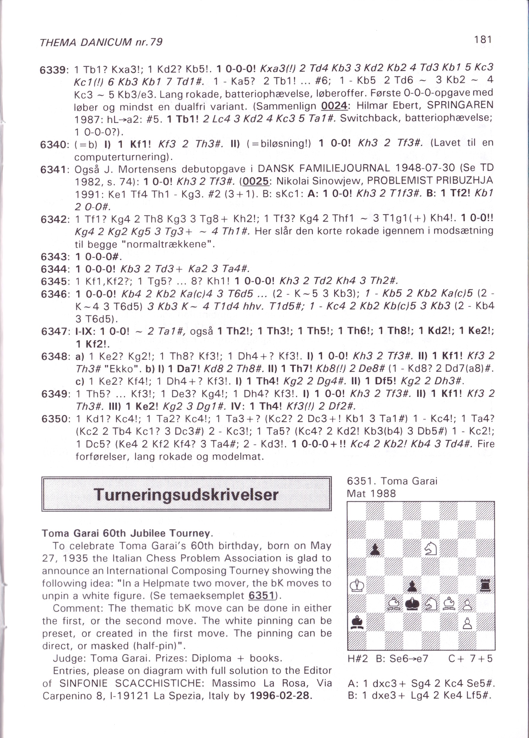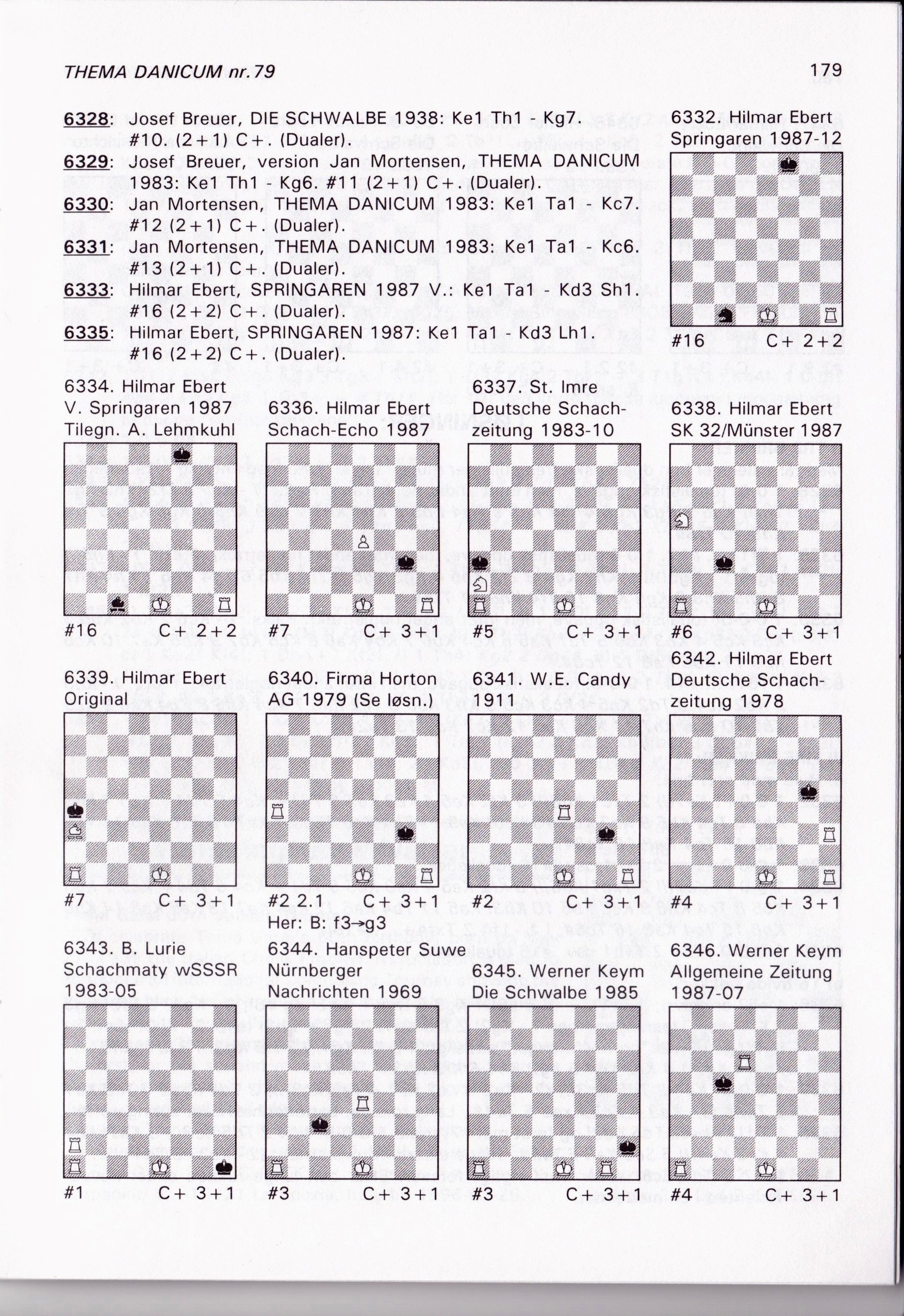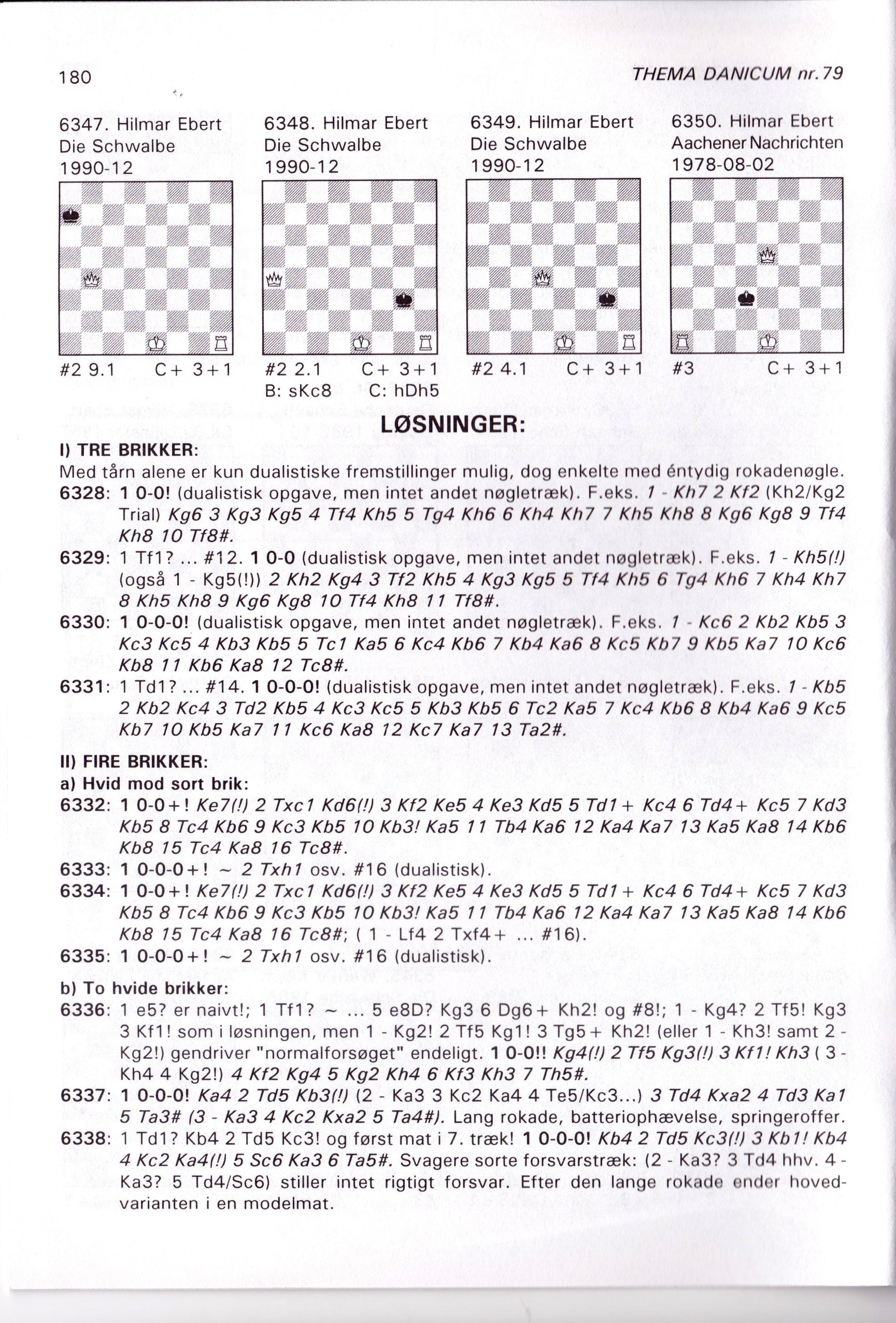 Nr. 12: 1.Tb1? Ka3:!; 1.Kd2? Kb5!; 1.0-0-0! Ka3:(!) 2.Td4 Kb3 3.Kd2 Kb2 4.Td3 Kb1 5.Kc3 Kc1(!) 6.Kb3 Kb1 7.Td1#: 1...Ka5? 2.Tb1! ... #6; 1...Kb5 2.Td6 ~ 3.Kb2 ~ 4.Kc3 ~ 5.Kb3/e3 ... Große Rochade, Batterieabbau, Läufer-Opfer. Erstes 0-0-0-Stück mit Läufer und mindestens eine dualfreie Variante. [Vgl. Hilmar Ebert, Springaren 1987/XII, Nr. 3: wL=a2, #5: 1.Tb1! 2.Lc4 3.Kd2 4.Kc3 5.Ta1# Rückkehr, Batterieabbau; 1.0-0-0?].