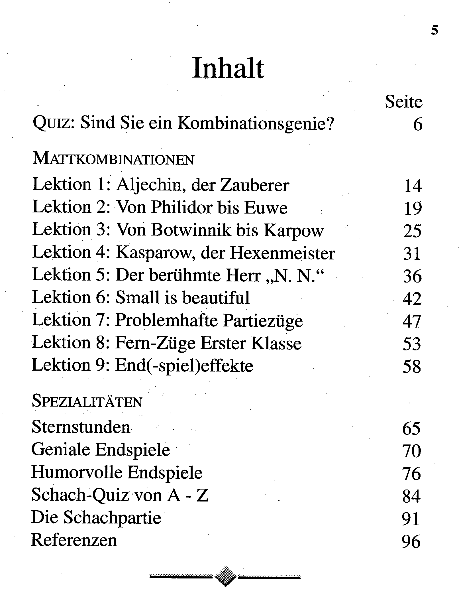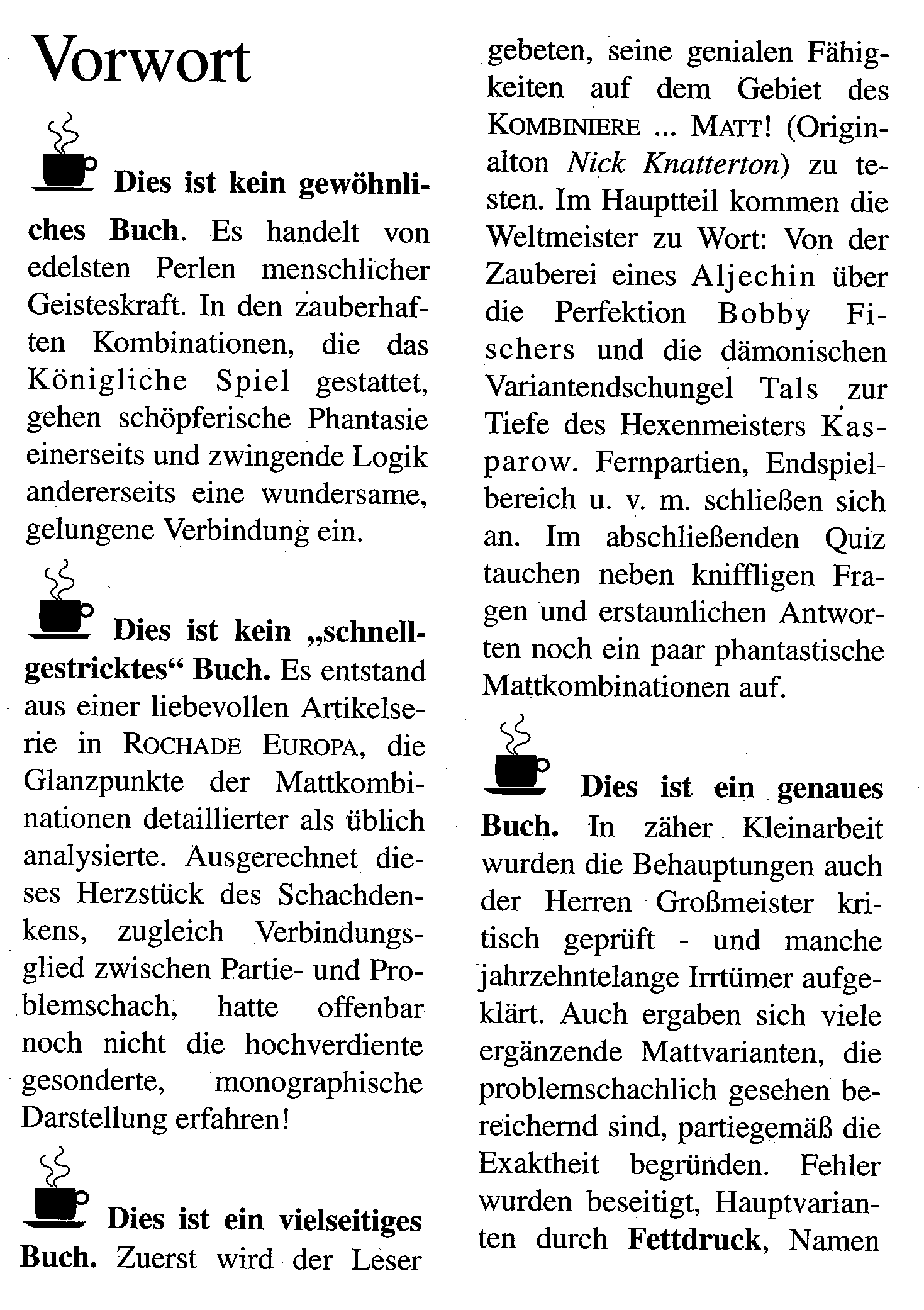 Kombiniere Matt (German) Maintal: Verlag: Rochade Europa ® ROCHADE@compuserve.com ISBN 3-920748-28-X 121 Diagramme 96 S. Genie-Test, Schach-Quiz, Mattkombinationen, Endspielkombinationen, Sternstunden, Kurzgeschichte |