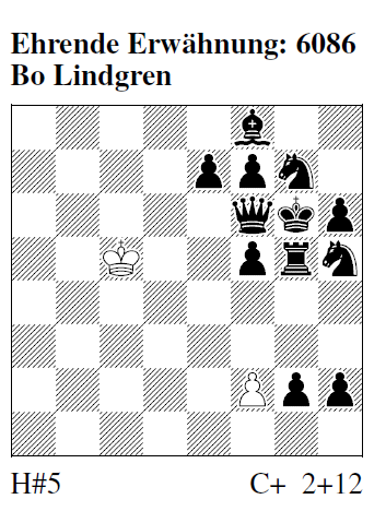 6086 (B. Lindgren) 1.h1=D! f4 2.Dha1 fxg5 3.g1=T! gxf6 4.Tg5! fxe7 5.Df6! exf8=S# GA: "D & T werden durch den wFreßbauern im Verlauf des Exzelsiormarsches geschlagen ‑ entstehen neu durch Umwandlung & kehren wie Phönix aus der Asche auf ihre Diagrammfelder zurück (weil sie als Block erforderlich sind). 3/4 AUW." KK: "Wiedererstandene D und wiedererstandener T. Die Stellung des wK ist entscheidend für die Eindeutigkeit des Lösungsverlaufs." AE: "Doppelter Phönix." HM: "Wiedergeburt von Dame und Turm." CP: "Wer hätte gedacht, daß die sBB die D und den T in gleichem Gewand ersetzen müssen? Ein erstaunliches Ende dann auch noch, denn der sK kommt zwar bis h8, kann aber keinen sT auf h7 einschleusen, um 5.‑ exf8=D# zu schaffen." mpk: "Grandioser zweifacher Ersatz der Blockfiguren, die auch als Schlagobjekte herhalten mußten." KHS: "Wiedergeburt von sD und sT und wB‑Exzelsior, reichhaltig!" TSt: "S stopft vorsorglich das Loch mit der gleichen Figur, das der Exzelsiorbauer aufreißen muß. 2x 'Prä‑Phönix'!" FR: "Geschlagene Blockfiguren werden durch Umwandlungsfiguren ersetzt, ein Stück für die Werbung." MPf: "wExzelsior in 1/2*100$-Manier kontra 2 sPhönixumwandlungen, die ihre Vorgänger auf exakt deren Originalstandplätzen ersetzen zum Mustermattblock. Die 'Verführung' 1.g1=T? scheitert an 2D‑T‑Verstellungen: h1‑>g1‑>a1 und h4‑>g5‑>f6. Ein schnörkelloses wMinimal aus Meisterhand." [3,3/II]
