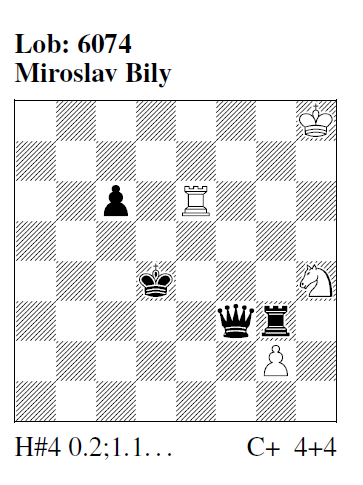 Lob 6074 (M. Bily): I) 1.‑ Sg6 2.Dc3 Sf4 3.Tf3 gxf3 4.c5 Te4# II) 1.‑ gxf3 2.Kd5 f4 3.Tc3 Sf5 4.Tc4 Te5# Bílý-typische Chamäleonecho-Mustermatts und DT-Schlag-/Blockwechsel: nicht ganz leicht zu lösen und luftig gesetzt.
