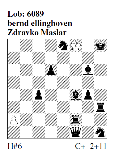 6088 (Z. Maslar)[v] 1.‑ Sd2+ 2.Ka1 Sf3 3.Ta8 Sxh4 4.Ta2 Sf3 5.Th1 Sd2 6.Tb1 Sb3# 1.‑ Sa5 2.Ka1 Sc6 3.Ta5 Sxe7 4.Ta2 Sc6 5.Te1 Sa5 6.Tb1 Sb3# Autor: "'Krumme' Touren des wS und Platzwechsel der sTT geben der Aufgabe m.E. volle Originalität. Eine Letztform!" Eine gewaltige Verbesserung einer Idee von Christer Jonsson (s. Diagr.: 1.‑ Sxc3+ 2.Ka3 Sd5 3.Sc3 Sxe7 4.Sa4 Sd5 5.Tb7 Sc3 6.Tb4 Sb1#; 1.‑ Sd2 2.Lc6 Sf3 3.Ka3 Sxh4 4.La4 Sf3 5.Th4 Sd2 6.Tb4 Sb1#). Eine wirkliche Letztform wurde in f‑102 als Nr. 6244 nochmals als Urdruck veröffentlicht. JBej: "Es war verführerisch, mit dem wK zu laufen!" mpk: "Ähnliche Linienöffnungen durch einen wS im H#6 habe ich in den letzten Jahren öfters gesehen, aber immer nur in einer Phase. Zauberer ZM zeigt wieder einmal, wieviel mehr er aus einer Idee herausholen kann als die meisten anderen!" FM: "Eindeutiger Springerrundlauf durch notwendige Beseitigung eines schwarzen Bäuerleins in Doppelsetzung. Dazu Blockwechsel der Türme." KHS: "Springerminimal, recht komplizierter Verlauf der Lösung." TSt: "2 Rückkehrmanöver des wS, wunderbar sparsam konstruiert, eine Klasseleistung, typisch Maslar." FR: "Wie ein Bumerang kehrt der wS auf sein Startfeld zurück, nachdem er jeweils einem sT den Weg zum Blockfeld freigeschlagen hat. Sehr sparsames, lösernahes Stück." MPf: "Herrlicher Gleichklang eines 3‑step-knight-switchback, für den ein Patent zugelassen werden sollte."[3,6/II]