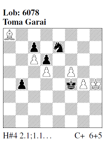 Lob 6078 (T. Garai): I) 1.Sxc6 f6 2.Se7 f7 3.Sxd5 f8=S 4.Se3 Sg6# II) 1.Sxd5 f6 2.Se7 f7 3.Sxc6 f8=L 4.Se5 Lh6# UW-Differenzierung zum Blockwechsel-Modellmatt nach sLinienfreilegungen mit Switchback; trotz relativ distanziertem Umgang der schwarzen und weißen HelpMATEs hier von Mozartscher Eleganz.