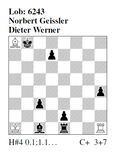 h#4, 0.1... (3+7) Lob 6243 (N. Geissler & D. Werner): 1. .. Txh4 2.Th1 Ta4 (Lxh1?) 3.Lf4+ Lxh1 4.Lc7 Ta8#. Maximaler wTL-Platzwechsel in minimaler Steinezahl, bis auf den Schlagschlüssel bestechend „einfach“ gelöst.