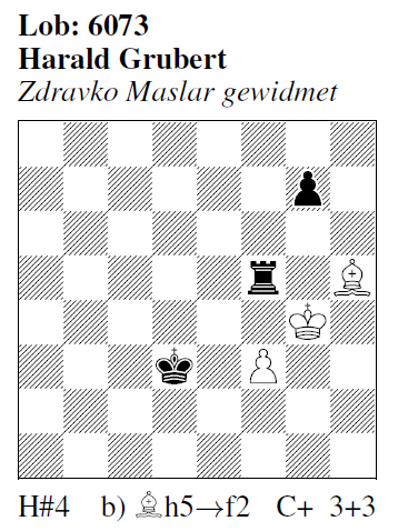 Lob 6073 (H. Grubert): a) 1.Tf6 f4 2.Ke4 Kg3 3.Kf5 Kf3 4.g6 Lg4# b) 1.g5 Lh4 2.Kd4 Kg3 3.Ke5 Kf2 4.Kf4 Lg3# Chamäleonecho-Idealmatts mit LK-„Turton“ in b) und ... F-Symbol (feenschach!) im Mattbild.