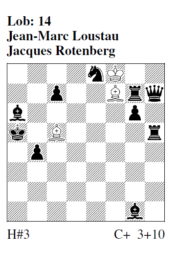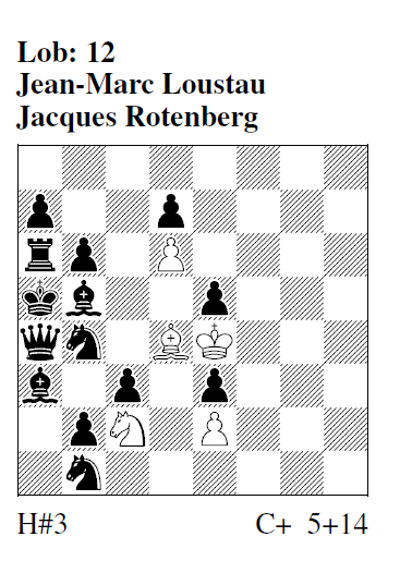 h#3 (3+10) Lob (14) S. 6 (Loustau & Rotenberg): 1.Sd6! Le8 2.Sf7! Ld6 3.c5 Lc7# Geschlossene Umnovkette mit sS/wL- und sB/wL-Platzwechsel, 2 sVerstellungen, Modellmatt - für eine solch nahrhafte Speise recht kalorienarm geglückt. Lob Jean-Marc Loustau & Jacques Rotenberg (12) S. 5