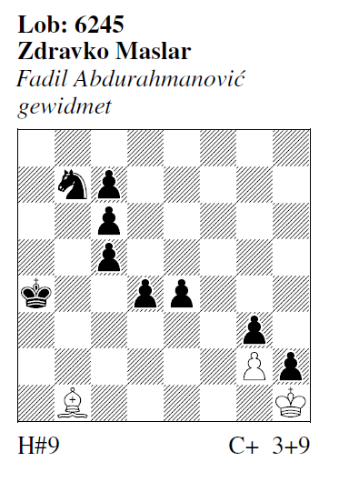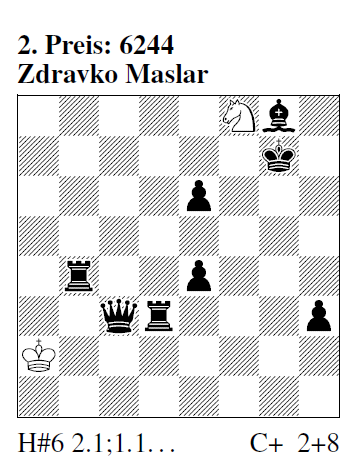 6244 (Z. Maslar) I) 1.Tb7! Sg6 2.Kh7 Sf4 3.Dh8 Sh3: 4.Tg7 Sf4 5.Th3 Sg6 6.Th6 Sf8# II) 1.Tg3! Sd7 2.Kh7 Sc5 3.Dh8 Se4: 4.Tg7 Sc5 5.Th4 Sd7 6.Th6 Sf8# 6245 (Z. Maslar) 1.d3 La2 2.d2 Lxc4 3.d1=L La6! 4.Lf3 gxf3 5.Ka5 f4 6.Kb6 f5 7.Ka7 fxe6 8.Kb8 e7 9.Kc8 e8=D# Zuglängstes Hilfsmatt, das mit Fesselungsmatt endet. Eine Reaktion auf die f‑100/6090 (Stankovic & Abdurahmanovic).