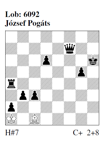 6092 (J. Pogáts) 1.Dh5 La3! 2.b2+ Kxa2 3.Th4 Kb3 4.g4 Kc4 5.Kg5 Kd5 6.b1=L Ke6 7.Lg6 Lc1# Autor: "Der NL‑Versuch geht nicht: 1.c2 Kb2 2.Dh7 Kc3 3.Ta7 Kd2 4.Tg7 Ke3 5.b2 Kf3 6.b1=L Kg4 7.? Lg5#, weil der sL nicht über den sBc2 springen kann." AE: "Erstens kommt es anders, und zweitens als man denkt." HM: "Außergewöhnliche Strategie." mpk: "Dreimal Verstellung für den wK! Wenn im L‑Minimal das Matt nicht auf einem Randfeld erfolgt, ist's immer besonders schwierig." FR: "Für dieses Stück habe ich so lange gebraucht wie für die restlichen Aufgaben von JP zusammen, wegen der vielen fiktiven Randmatts, die alle nicht realisierbar sind, ungemein schwer zu lösen. Aber der Co dürfte auch nicht viel schneller sein." MPf: "Dieses Matt zu finden hat Schweiß gekostet." Hat niemand gesehen, daß der wL eine Rückkehr im Mattzug ausführt? [2,9/III]