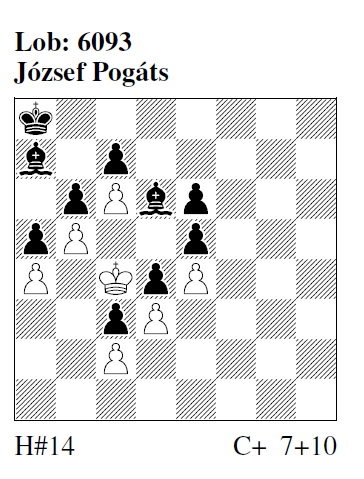 6093 (J. Pogáts) 1.Kb8 Kb3 4.Ke7 Kc1 5.La3+! Kd1 8.Kb4 Kg4 9.Kxa4 Kg5 10.Kxb5 Kf6 11.Ka4 Kxe6 12.b5 Kd5 13.b4 Kc4 (Rundlauf) 14.b3 cxb3# Co ab einschließlich 10.Kxb5. HM: "Ich finde da keine Lösung, bin ich blind oder ist das Stück verdruckt oder was ist da los?" Los sind hier die Könige! Es ist selten bei solchen Langzügern, daß beide Könige von Anfang an wandern wie der berühmte Müller. CP: "Das Schwerste und Schönste zugleich, find ich." FM: "Beachtlicher weißer Königsrundlauf über 13 Stationen." FR: "Unschematischer Langzüger ohne die gewohnten Manöver, pfiffige Rückkehr des wK." MPf: "Riesenrad des wK nur um den sK auf sein Mattfeld gelangen zu lassen. Schade um den Notnagel La7."[3,3/II]
