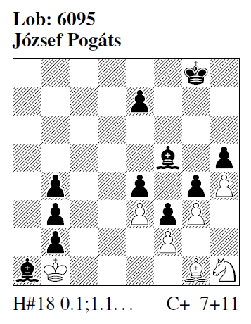 6094 (J. Pogáts) 1.Ka7 Lc8 2.h6 Lb7 3.h5 Lxa8 4.Kxa8 Kc1 5.La7 Kd1 10.Kf8 Kxe3 13.Kxe6 Kxb4 14.Kd6 Kxb3 15.Kc5 Ka3 16.Kxb5 b4 17.Ka6 Ka4 18.e6 (Tempo) b5# Co ab einschließlich 14.Kd6. Auch hier sind beide Könige von Beginn an aktiv; vielleicht machte es das nun etwas einfacher?! AE: "Diesmal etwas zu leicht." HM: "Seeschlange Marke P." CP: "Wozu den wenig feinen sK-Zug? 0.1.1... hätte auch gereicht!" MPf: "Immerhin ein 'Beinahe-Rundlauf' des sK in diesem Rekord(?)-Stück. Zumindest für eine Aufgabe ohne Umwandlung eigenartig lang."[2,4/II]