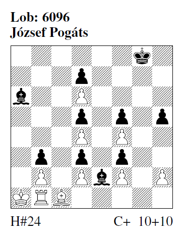 Lob 6096 (J. Pogáts): 1.Ld1 h3 2.Lc2 h4 3.Lxb1 Kxb1 4.Kf7 6.Kxd6 10.Kxd4 12.Kxf4 16.Kxf2 17.Ke1 18.f2 19.f1=S! Kb1 20.Se3 dxe3 21.d2 e4 22.d1=L! Lf4 23.Lf1 Kc1 24.Lde2 Lg3# Seeschlangen-Phönix, beachtliche Konstruktionsleistung.