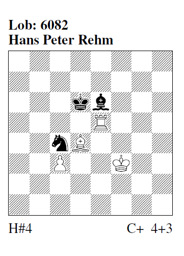 6082 (H. P. Rehm) 1.Lf5 Le3 2.Te6 Lc1 3.Ke5 Lb2 4.Sd6 c4# AE: "Schönes Idealmatt und ganz schön schwer." HM: "Das ist ja eine gemeine Hintenherumgeschichte." mpk: "Schwarze Umnowkette, während W das derzeitige H#‑Lieblingsthema des Autors zeigt." FM: "Wie im Leben. Der große Feigling (L) versteckt sich hinter dem Kleinen (B) und schiebt diesen vor." TSt: "Schöne L/B‑Hinterstellung in bestechender Form, außerdem (für mich) schwierig zu lösen." MPf: "Schwarze Umnowkette und weiße perikritische Hinterstellung. Prima Miniatur!"[2,9/II]