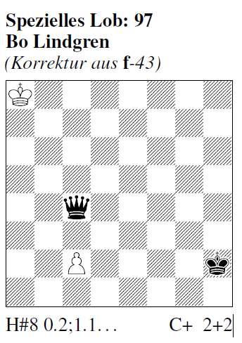 Spezielles Lob S.384 (Lindgren): I) 1...Kb8! 2.Dd5 c4 3.Kg3 cd5: 4.Kf4 d6 5.Ke5 d7 6.Kd6 Ka7 7.Kc7 Ka6 8.Kb8 d8D# II) 1...c3! 2.Dd4! cd4: 3.Kg3 d5 4.Kf4 d6 5.Ke5 d7 6.Kd6 Ka7 7.Kc7 Ka6 8.Kb8 d8D# Wunderbarer Wenigsteiner, der - auch laut SAM - aus der Nebenlösungs-Not eine Zwillingsrekord-Tugend macht ...