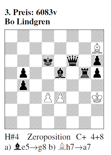 3. Preis 6083v (B. Lindgren): a) 1.La2! Lg8 2.Ke5 Lb3 3.Kf5 Lc2 4.Le6 d4#; b) 1.Lh2! Lb8+ 2.Kc5 Lg3 3.Dc6 Lf2 4.Ld6 e4#