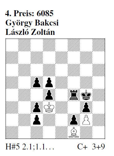 4. Preis 6085 (G. Bakcsi & L. Zoltán): I) 1.c1=S+ Kc2 2.Sd3 Kd1 3.Se1 Ke2 4.Sxg2 Kd3 5.Kf3 Le2# II) 1.c1=D Ke2 2.De3+ Kd1 3.Df3+ Kc2 4.Dxg2 Kd3 5.Kf3 Le2#