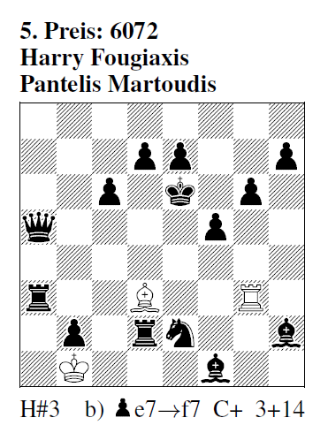 6072 (H. Fougiaxis & P. Martoudis) a) 1.Sd4 Tg2 2.Ld6 Te2+ 3.De5 Lc4# b) 1.Sf4 Lc2 2.Td6 Lb3+ 3.Dd5 Te3# AE: "Sehr schön und harmonisch." HM: "Ausgesprochen raffiniert gemacht." mpk: "Sehr subtile Rückzüge der weißen Figuren! Tolles Stück!" FM: "Wundervolle, reichhaltige Linienmanöver mit feinem Wechsel der weißen Themenfiguren in a) und b) in bemerkenswerter Harmonie." KHS: "Komplizierte Verstell‑ und Fesseltechnik, gut, wenn auch nicht schwer zu finden." FR: "Hervorragende Harmonie, mit einheitlichen Mitteln werden die vier sLangschrittler ausgeschaltet. Für mich das beste H#3!" MPf: "Phantastisch! Ein Feuerwerk von Verstellungen, Verstellmeidungen, Linienöffnungen + Fesselungen."[3,7/II]