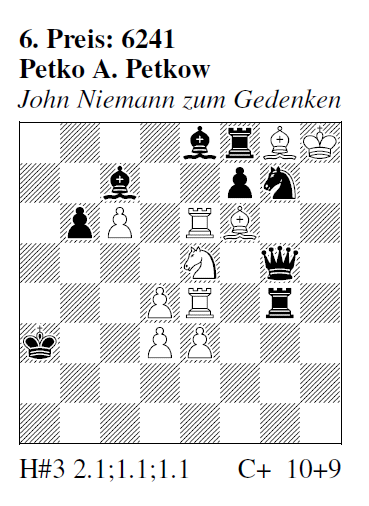 6064 (D. de Irezabal)[a?] 1.Kc5 Sxf5 2.Th6 Lb3 3.Tc6 d4# 1.Kd5 d4 2.Lb5 Sxf5 3.Lc6 Lb3# 1.Kd6 Lb3 2.Tc1 d4 3.Tc6 Sxf5# Zyklus abc‑bca‑cab der weißen Züge mit 3 verschiedenen Blocks auf demselben Feld. BH: "Sehr schön." HM: "Toller ABC-Zyklus mit Blockwechsel." FM: "Dreiphasiger Zyklus der weißen Züge, dreifacher Block auf c6 nach differenzierter weißer Linienfreigabe. Beachtliche Konstruktionsleistung voller Harmonie." PS: "Das ist ziemlich genial." FR: "Der sattsam bekannte vollständige Zyklus der wZüge erhält hier etwas Glanz durch das einheitliche schwarze Spiel mit den drei verschiedenen Blocksteinen auf c6." MPf: "Zyklus der wZüge jeweils mit Block auf dem Standfeld des sK und Linienfreilegung im 1.wZug für den Blockstein." AM: "Das sSpiel ist nicht ganz astrein begründet, aber ansonsten ein großartiges Problem." AEs Verdacht ("habe ich schon öfters gesehen" konnte ich mit Hilfe der Niemannsammlung leider massiv untermauern: Es gibt fast 10 solcher Beispiele (s. Diagr.; einige überstanden den Computertest nicht), eine (noch dualistische!) Aufgabe hat fast genau das gleiche Schema wie 6064. Sysonenko e4/c6: 1.d1=S La3 2.Sc3+ Ke3 3.Sb5 Lg2#; 1.Kc5+ Ke3 2.Lc6 Lg2 3.Lb5 La3#; 1.c3 Lg2 2.f1=L La3 3.Lb5 Ke3# (Typ KLL; zwei der drei Blockfiguren entstehen durch Umwandlung; das Blockfeld ist nicht mit dem Diagrammkönigsstandfeld identisch). Sysonenko h5/e1: 1.Kd2 Lc2 2.Sd3 Sd4 3.Se1 Lf4#; 1.Kd1 Sd4 2.De8 Lf4 3.Db5 Lc2#; 1.Ke2 Lf4 2.Td1 Lc2 3.Te1 Sd4# (Typ LLS). Sysonenko g1/d5: 1.Kd6 Le4 2.Ld7 d4 3.De6 Lc5#; 1.c5 d4 2.c4 Lc5 3.Se6 Le4#; 1.Ke5 Lc5 2.Tf6 Le4 3.Le6 d4# (Typ LLB; das Blockfeld ist nicht mit dem Diagrammkönigsstandfeld identisch). Keinz: 1.Lg2 Sd3 2.Kf3 Lf2 3.Se4 Se5#; 1.Sf5 Lf2 2.Kxf4 Se5 3.Te4 Sd3#; 1.Td2+ Se5 2.Ke3 Sd3 3.Le4 Lf2# (Typ LSS). Grubert: 1.De2 Sc3 2.Kd4 Sg4 3.Dd3 Le5#; 1.Sb2 Sg4 2.Ke4 Le5 3.Sd3 Sc3#; 1.Td7 Le5 2.Ke3 Sc3 3.Td3 Sg4# (Typ LSS). Sysonenko g1/d5: 1.Ke6 e5 2.Lg6 Sc6 3.Lf7 Lh3# (DL 2.Le4 Sd3 3.Kf5 Lh3#); 1.Kf6 Sc6 2.Db7 Lh3 3.Df7 e5#; 1.Ke7 Lh3 2.Tf1 e5 3.Tf7 Sc6# (Typ LSB).[3,3/II]