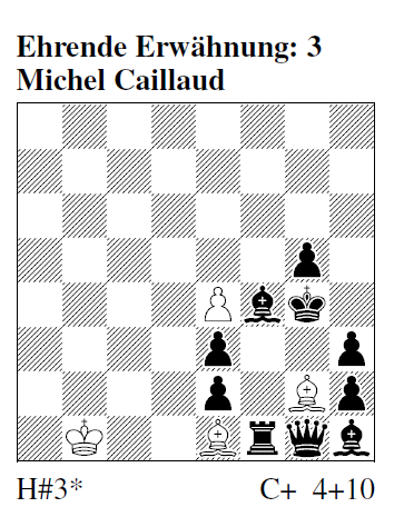 Ehrende Erwähnung (3) S. 2 Caillaud: * 1...Lf1: 2.Le4:+! K~ 3.Lf5 Le2:# 1.Tf2! Lf1 2.Tg2 Lf2 3.e1L! Le2# Schwarze und weiße Entfesselung des wLe1, Verstellung des Lh1, Verstellung des T / Fesselung des Lf1, Entfesselung des Lf1, Modellmatt - das ist schon alleine eine imponierende Kompositionsdichte dieser geschlossenen Umnovkette. Aber hinzu tritt hier auch noch ein netter Zugwechseleffekt (!), wobei auch der Zug des wK problemlos eindeutig wird mittels +sBBb2,b3 (kleine Preisrichterempfehlung am Rande). Insgesamt: knuffige Stellung mit faszinierender Ausstrahlung!