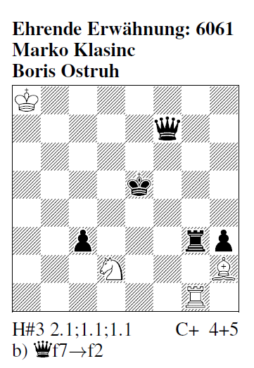 Ehrende Erwähnung 6061 (M. Klasinc & B. Ostruh): a) I) 1.Ke6 Se4 2.Td3 Tg5 3.Td7 Te5# II) 1.Kf5 Sf3 2.Tg6 Tg4 3.De6 Tf4# b) I) 1.Kf4 Sc4 2.Kf3 Te1 3.Tg2 Se5# II) 1.De3 Sc4+ 2.Ke4 Td1 3.Tf3 Sd6#