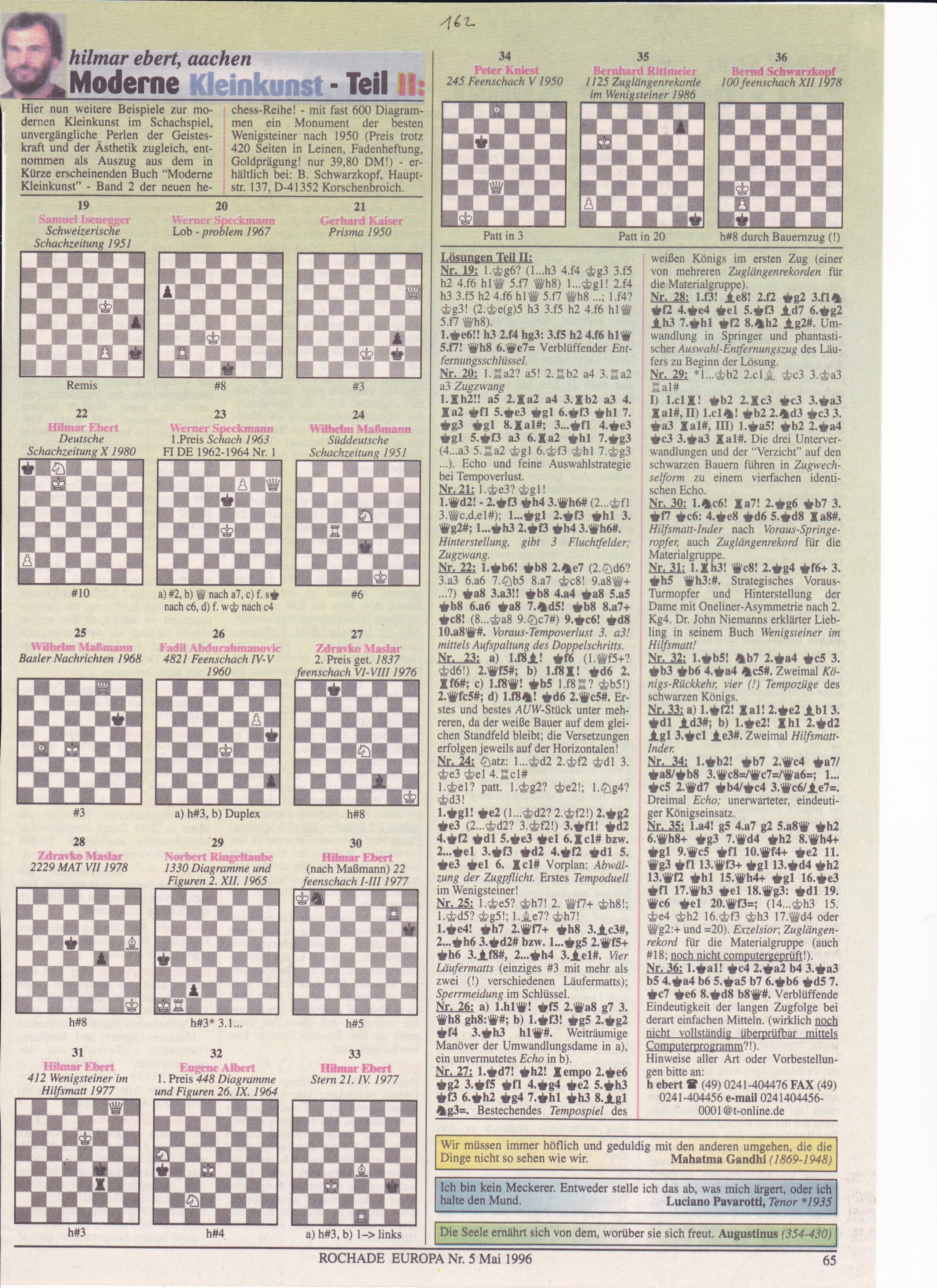 Wie das Zitat beweist, wurde schon vor ca. 2500 Jahren das Kleine und Wenige als das eigentlich Große und Viele erkannt und verehrt ... Auch auf dem Schachbrett - und im Herzen der Schachspieler! - sind gerade die herausragenden Leistungen in Partieendspiel, Studien- und Problemkunst oft in besonderer unauslöschlicher Erinnerung, werden gerade diejenigen ultimativen Geistesblitze begeistert weitergezeigt, die in edler Begrenzung der Steinezahl das Geheimnis des Schachspiels konzentriert, kompakt und gebündelt auf wenige Steine fokussieren! Die folgenden Perlen der Schachkunst sind kleine Kostproben des in Kürze erscheinenden Buches des Autors (mit H. Gruber) „Moderne Kleinkunst“ - Band 2 der neuen he-chess-Reihe! - nach ca. 20 Jahren intensiver Erforschung des Wenigsteiners und Aufbau der weltgrößten Sammlung auf diesem Gebiet („SAM“, ca. 25000 Stücke mit höchstens vier Steinen.) mit fast 600 Diagrammen ein Monument der besten Wenigsteiner nach 1950. Zugleich liegt hiermit eine Dokumentation der Jahrespreise für die beste schachliche Kleinkunst seit 1979 vor (Preis trotz 420 Seiten in Leinen, Fadenheftung, Goldprägung nur 39,80 DM!) - erhältlich bei: B. Schwarzkopf, Hauptstr. 137, D-41352 Korschenbroich.
