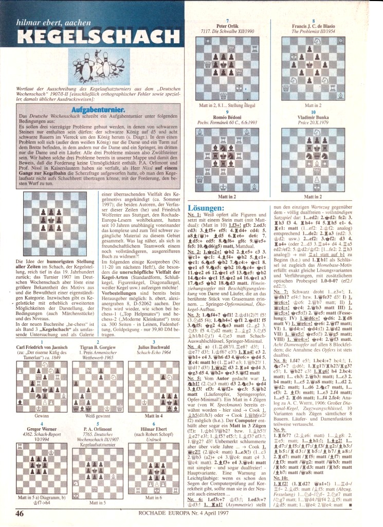 Die Idee der humorigsten Stellung aller Zeiten im Schach, der Kegelstellung, reicht tief in das 19. Jahrhundert zurück; das Turnier 1907 im Deutschen Wochenschach aber löste eine größere Bekanntheit des Motivs aus und die Bewußtheit einer eigenständigen Kategorie. Inzwischen gibt es Kegelstücke mit erheblich erweiterten Möglichkeiten der Darstellung, der Bedingungen (auch Märchenstücke) und des Niveaus. In der neuen Buchreihe „he-chess“ ist als Band 3 „Kegelschach“ als umfassende Untersuchung und als Galerie einer überraschenden Vielfalt des Kegelmotivs angekündigt (ca. Sommer 1997); die beiden Autoren, der Verfasser dieser Zeilen (he) und Friedrich Wolfenter aus Stuttgart, den Rochade-Europa-Lesern wohlbekannt, hatten seit 10 Jahren unabhängig voneinander das komplexe und zum Teil schwer zugängliche Material zu diesem Gebiet gesammelt. Was lag näher, als sich in freundschaftlichem Teamwork einem noch vollständigeren, ausgereifteren Buch zu widmen?! Im folgenden einige Kostproben (Nr. 11-20 im nächsten Heft!), die besonders die unerschöpfliche Vielfalt der Kegel-Arten (Standardform, Schlußkegel, Figurenkegel, Diagonalkegel, weißer Kegel usw.) aufzeigen möchte! Vorbestellungen sind bereits beim Herausgeber möglich: ® h. ebert, alexianergraben 8, D-52062 aachen. Der Preis wird wieder, wie schon bei he-chess-1 („Top Helpmates“) und he-chess-2 („Moderne Kleinkunst“) trotz ca. 300 Seiten - in Leinen, Fadenheftung, Goldprägung - nur 39,80 DM betragen.